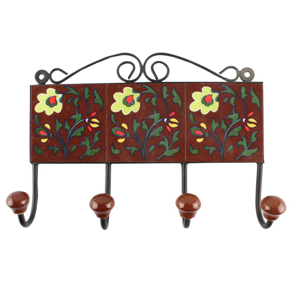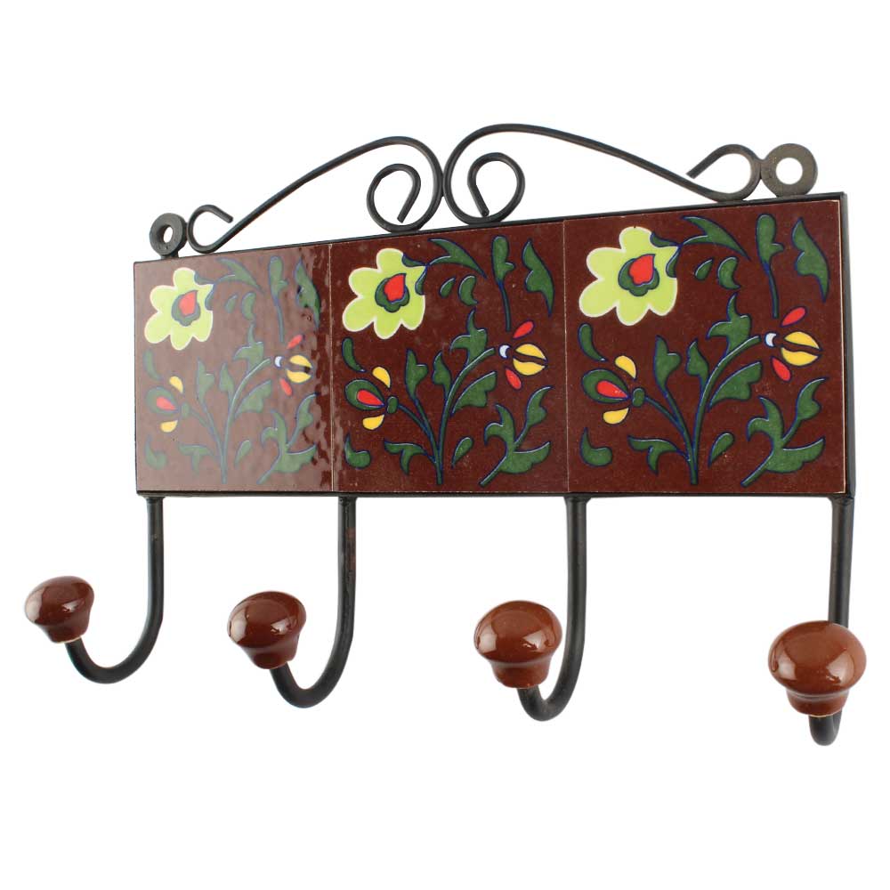 Dark Brown With Forest Green Leaf Ceramic Tile Hook. When Put on Wall or Cabinet It is An Art in Itself. The Metal Part of this Hook is Black Powder Coated.