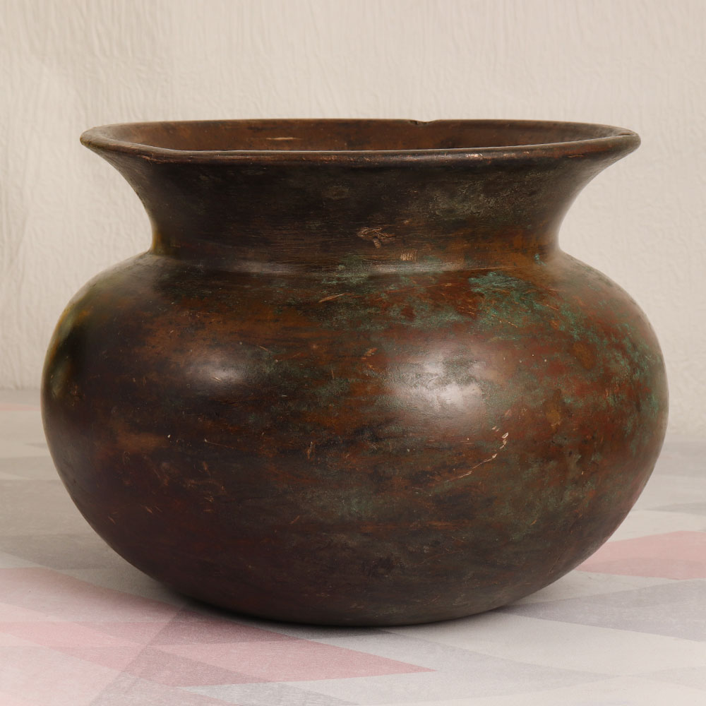 A vintage brass cooking pot that is meticulously handmade by highly skilled Indian artisans in the Assamese Art tradition. With its antique brown finish and high-quality brass construction, this unique piece is a testament to timeless craftsmanship. This vintage brass cooking pot transcends its culinary roots to become a versatile decorative item. Whether gracing your home, office, restaurant, hotel, cafe, or shop, it brings a touch of elegance to any setting. It’s warm, rustic charm makes it an ideal choice for indoor flower arrangements, breathing life into your space in a distinctly vintage manner. While this pot bears the history of culinary traditions, we recommend its use purely for decoration purposes, preserving its vintage allure. It's a prized addition to any antique collection and a thoughtful gift for your family, friends or relatives on special, festive, or auspicious occasions.