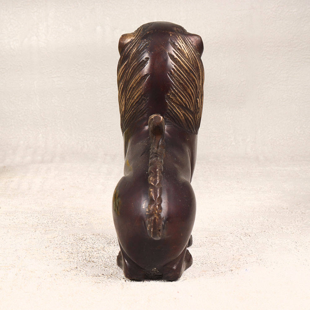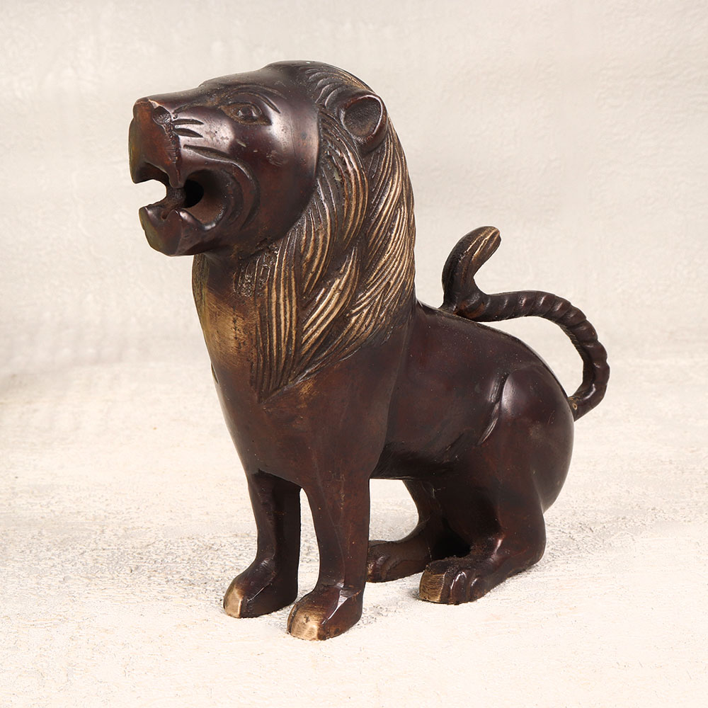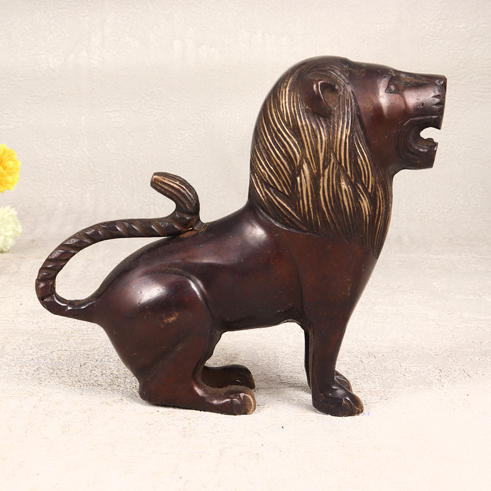 A Brass Lion Statue that is a magnificent piece of artistry crafted by highly skilled and experienced Indian artisans. Standing proudly with regal poise, this awe-inspiring lion statue boasts a lustrous dark brown finish, adding a touch of sophistication to any space. Handmade with precision and care, the statue is forged from high-quality brass, ensuring durability and a timeless appeal. This majestic lion statue is a versatile decor piece suitable for a variety of settings, including homes, offices, restaurants, hotels, and cafes. Its captivating presence elevates the ambiance, making it a perfect addition to both contemporary and traditional spaces. The dark brown finish accentuates the intricate details and craftsmanship, creating a visual masterpiece that captures attention and admiration. Not just a decor item, this brass lion statue can become a cherished part of vintage collections, symbolizing strength, courage, and grace. Furthermore, it serves as an impeccable gift for your family, friends or relatives during special, festive, or auspicious occasions, adding a touch of cultural richness and artistic beauty to their lives.