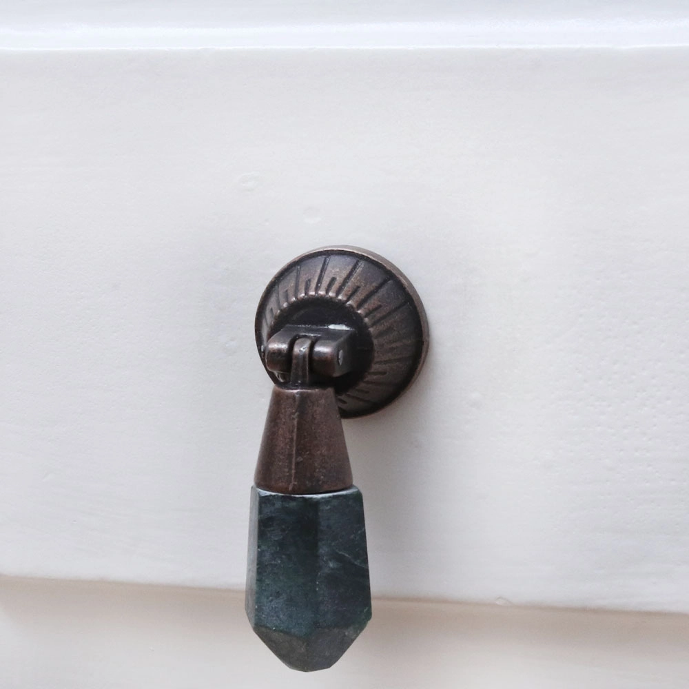 Buy a Stone and Metal Knob online which is a true masterpiece crafted with precision and care by highly skilled Indian artisans. This knob is a testament to the rich heritage of craftsmanship that has been passed down through generations. The knob features a captivating blend of stone and metal, meticulously handcrafted to perfection. Its dark finish adds a touch of elegance and sophistication to any furniture piece, making it an ideal choice for your Drawer, Dresser, Cabinet, Wardrobe, Cupboard, or almirah. Each knob is a unique work of art, showcasing the artisan's attention to detail and dedication to quality. The combination of stone and metal creates a harmonious balance between rustic charm and modern aesthetics, making it a versatile addition to any decor style. Beyond its aesthetic appeal, this knob serves as a thoughtful gift for your loved ones on special or festive occasions. It carries with it the essence of Indian craftsmanship, making it a symbol of tradition and timeless beauty.