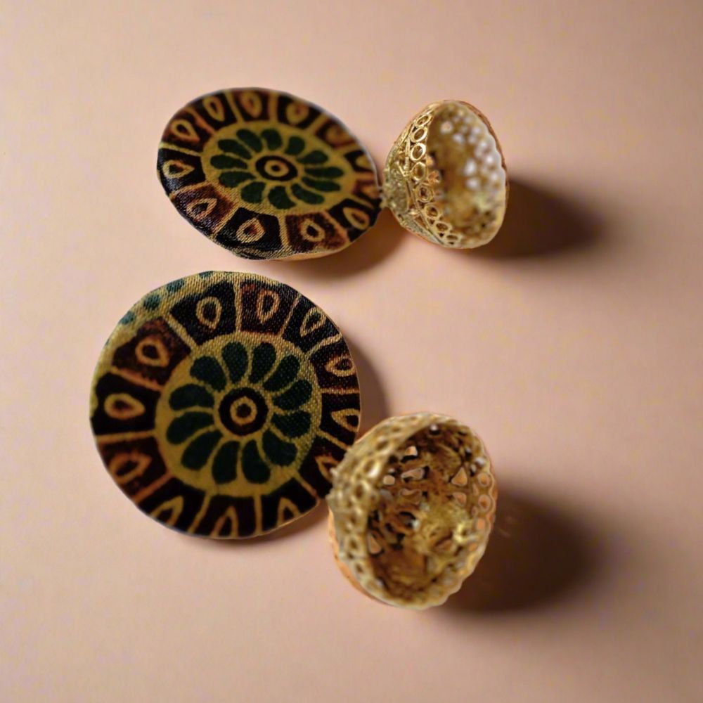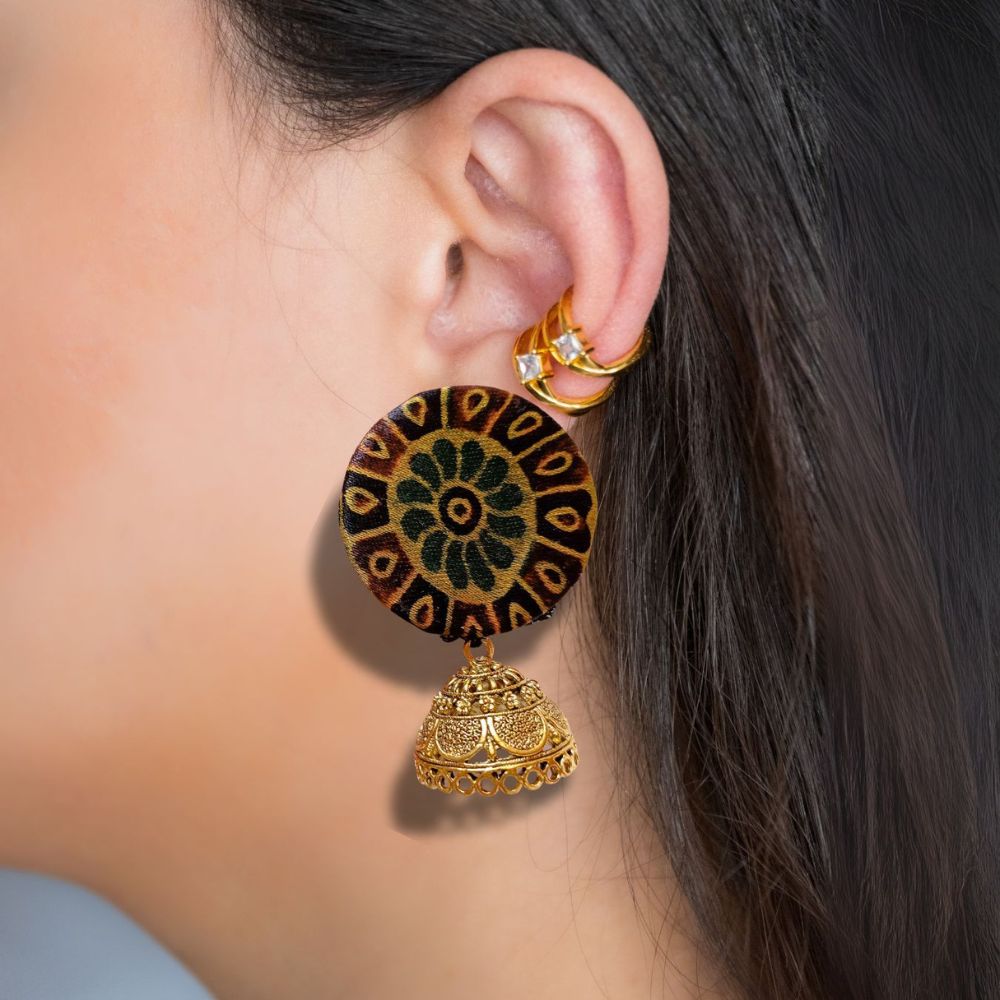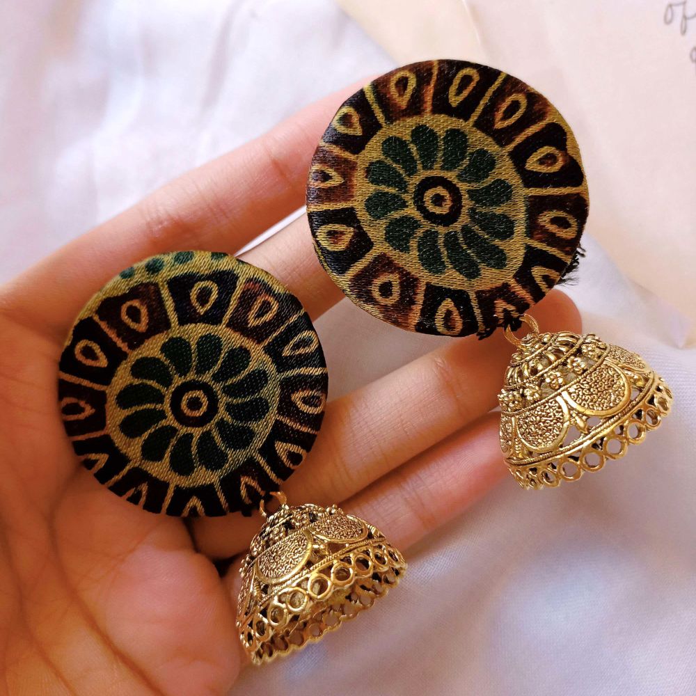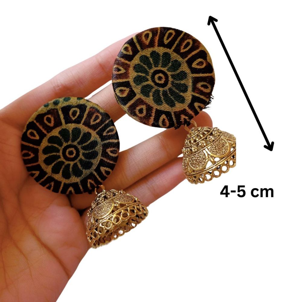 Style these earrings with silk kurtas, cotton sarees, or Indo-western outfits, and store them in a dry pouch to preserve the fabric print and golden finish.