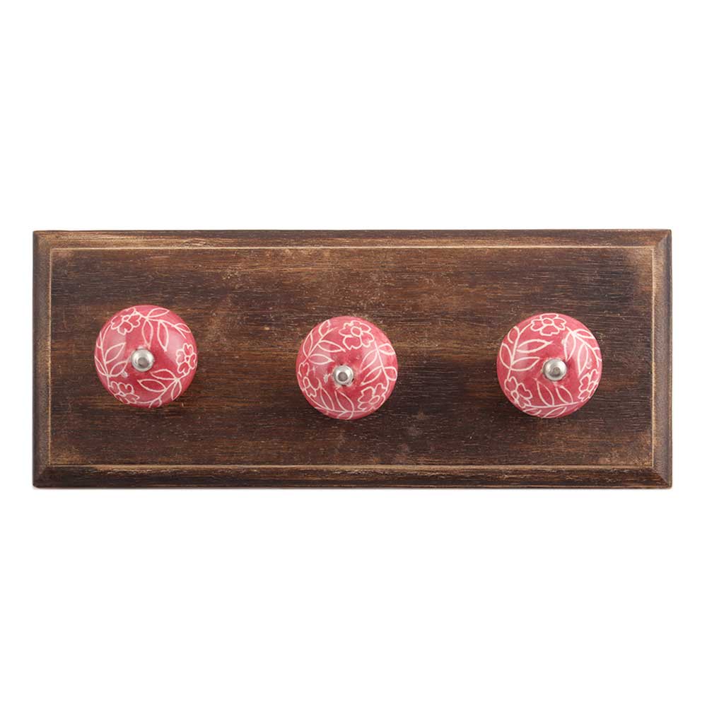 Dark Pink Leaf Floral Ceramic Wooden Hook. A Perfect Complement to the Soft Tone of the Wood are these White Traditional Hat & Coat Hook Made of Genuine Porcelain and Brass. It can be use to Hang Jewellery, Leashes, Towels, Scarves, Light Weight Sweaters, Caps Etc.