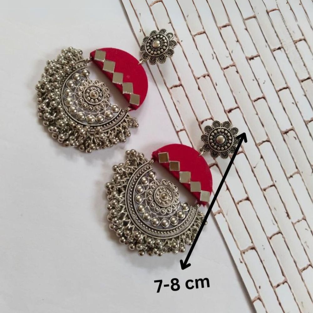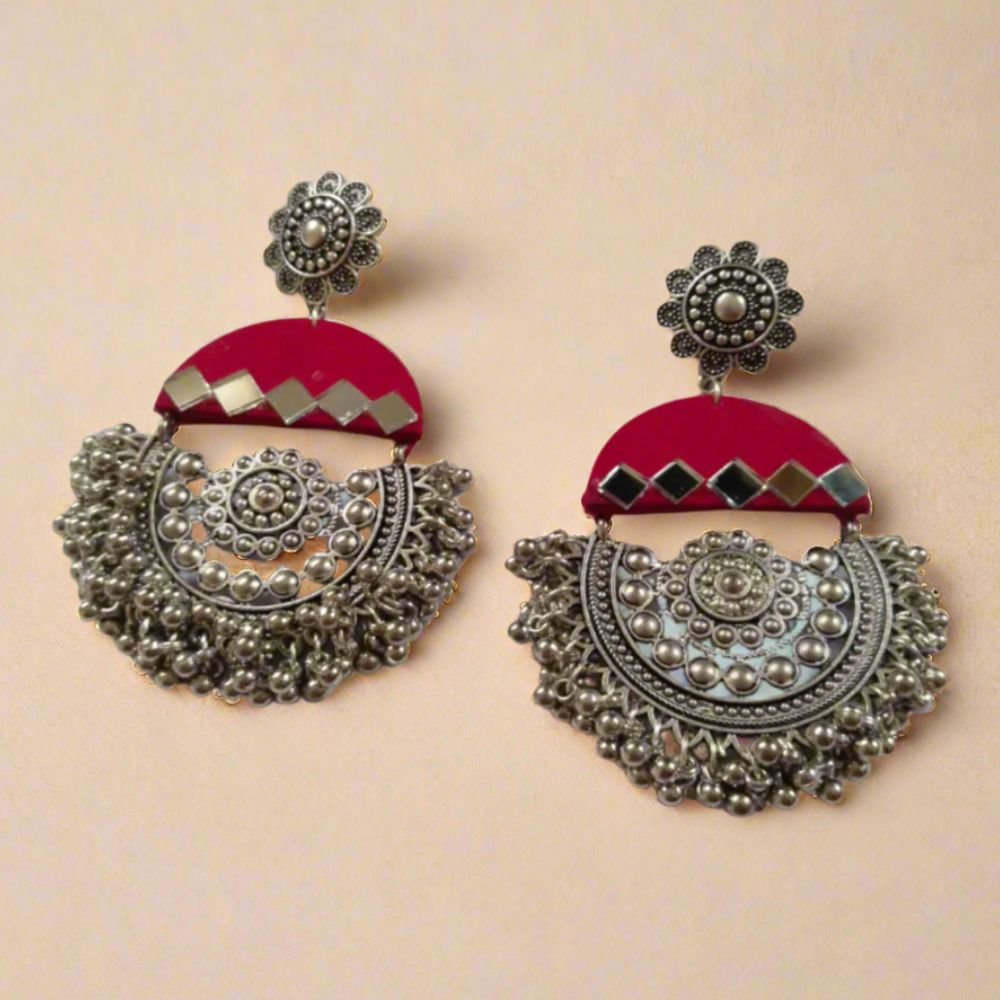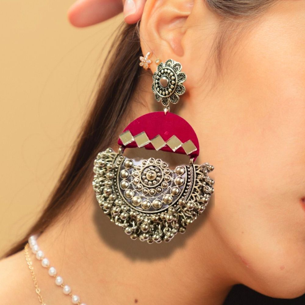 The Dark Pink Mirror Oxidized Heavy Jhumka Earrings are designed to make a bold, celebratory impression rooted in traditional Indian aesthetics. Crafted on a fabric base, the rich dark pink tone brings intensity and warmth, while mirror accents add reflective depth and festive sparkle. Finished with oxidized detailing, the heavy jhumka silhouette feels regal and heirloom-inspired. Despite their grand look, the earrings remain thoughtfully balanced for comfortable wear.