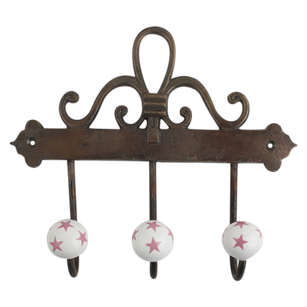 Dark Pink Star Ceramic Iron Hook. A Perfect Complement to the Soft Tone of the Wood are these White Traditional Hat Coat Hook Made of Genuine Porcelain and Brass. It can be use to Hang Jewellery, Leashes, Towels, Scarves, Light Weight Sweaters, Caps Etc.
