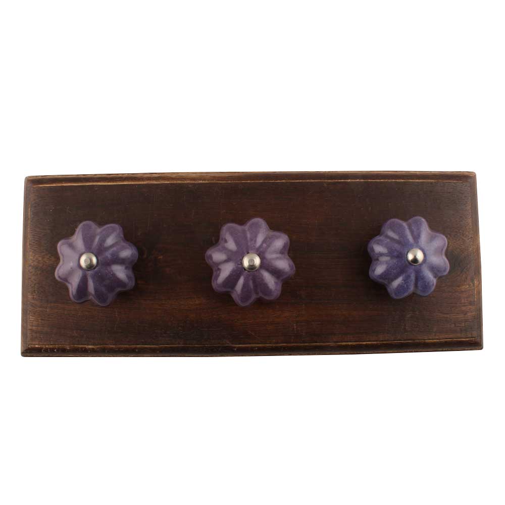 Material: Solid Natural wood with kiln-fired ceramic knob Finish: Deep purple crackle glaze on ceramic; sealed natural wood base Installation: Hidden screw mount with included anchors and hardware