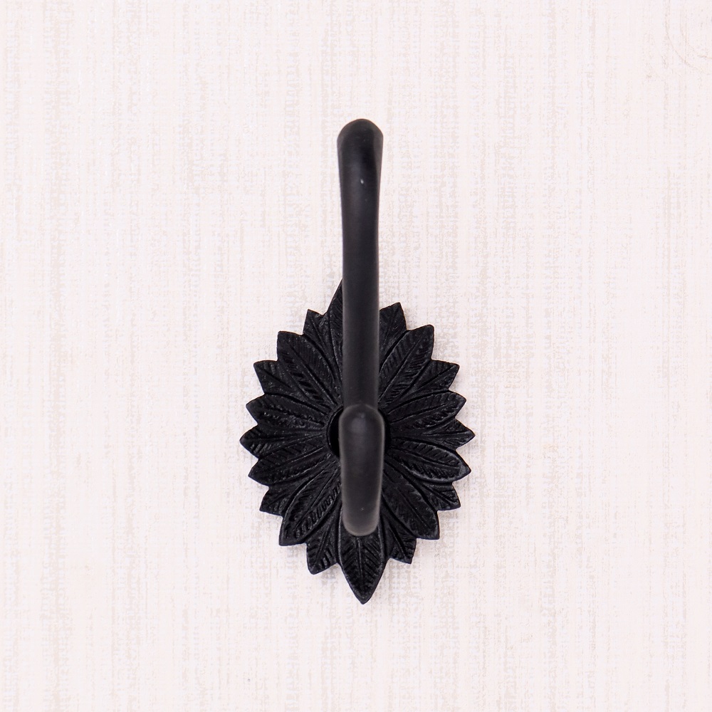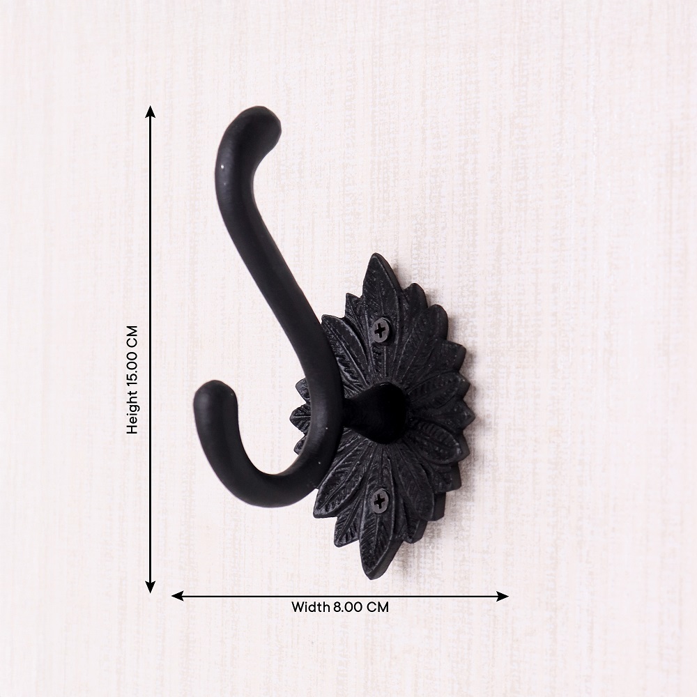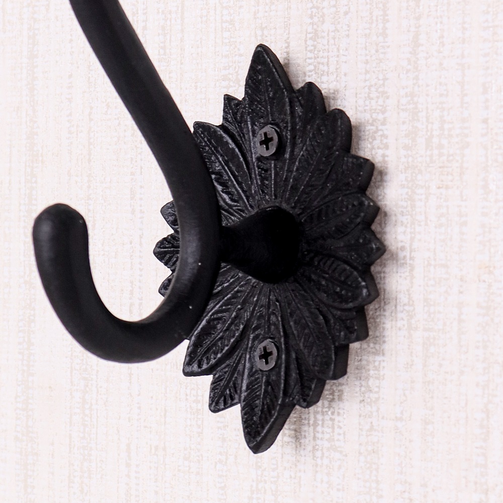 Add charm and convenience to your bathroom or vanity area with this vintage-style black aluminum wall hook. Designed with a detailed floral backplate and dual-hook arms, it offers a sturdy solution for hanging bathrobes, loofahs, towels, or accessories. Crafted from rust-resistant aluminum with a matte black finish, this hook brings both style and functionality to any space.