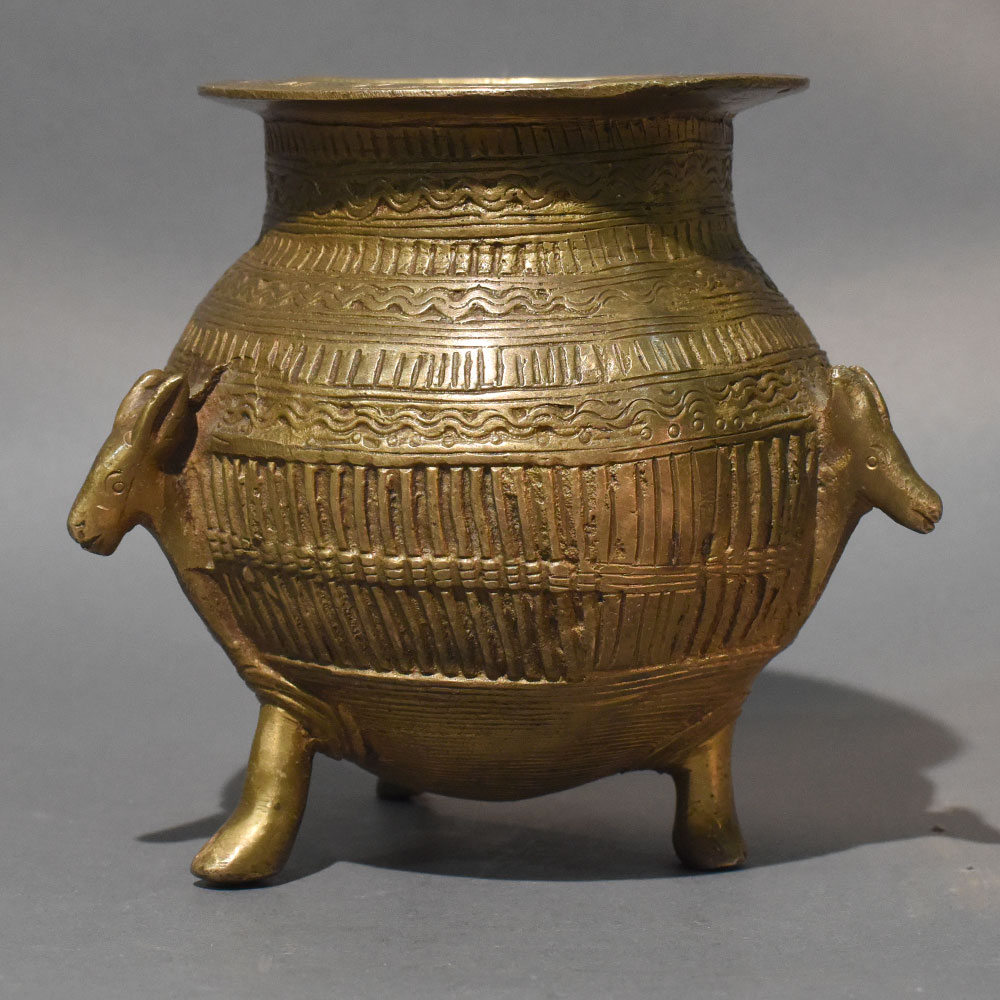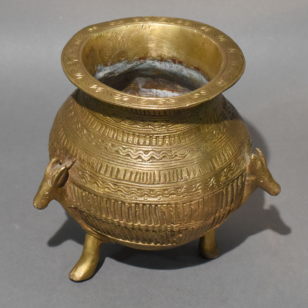 This decorative brass urli pot with animal handles features a striking sculptural form enriched with detailed handcrafted patterns. The rounded body is supported by three sturdy legs, creating elevated placement and visual balance. Distinctive animal-shaped side handles add character and cultural symbolism, transforming the vessel into a statement ritual and decorative piece. The surface is adorned with horizontal textured bands, engraved motifs, and linear detailing that wrap around the body. The wide flared rim enhances the traditional silhouette while providing functional access. The warm brass finish displays natural patina and subtle tonal variations, highlighting its artisanal construction and antique appeal. Traditionally inspired by ceremonial vessels, this brass pot can be used in pooja rituals, festive altar setups, or as a decorative centerpiece. It can hold flowers, sacred water, or diya arrangements during religious occasions such as Navratri, Diwali, weddings, and temple ceremonies. The raised tripod base ensures stability while adding sculptural dimension to the overall design. Crafted from solid brass using traditional casting and shaping techniques, the vessel offers durability and long-term use. Over time, the brass develops a deeper, richer tone, enhancing its heritage value. Each piece carries slight variations in texture and detailing, reflecting authentic handcrafted workmanship.
