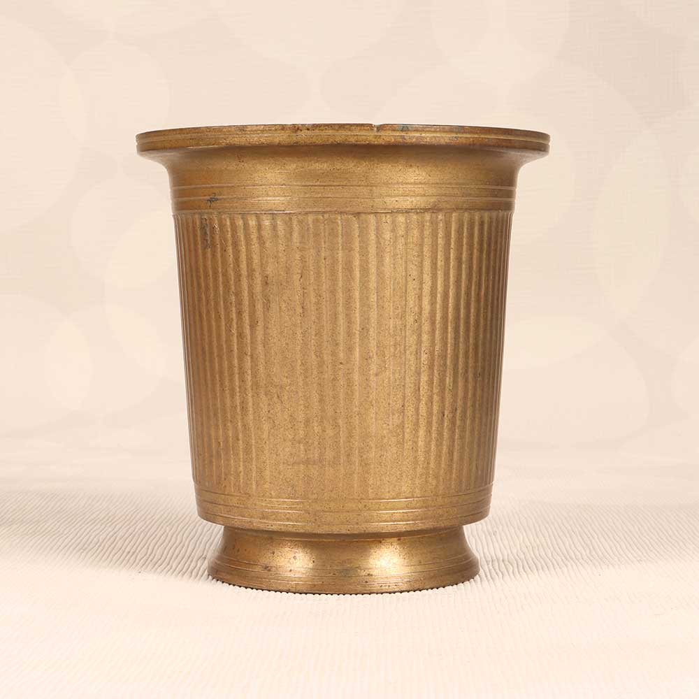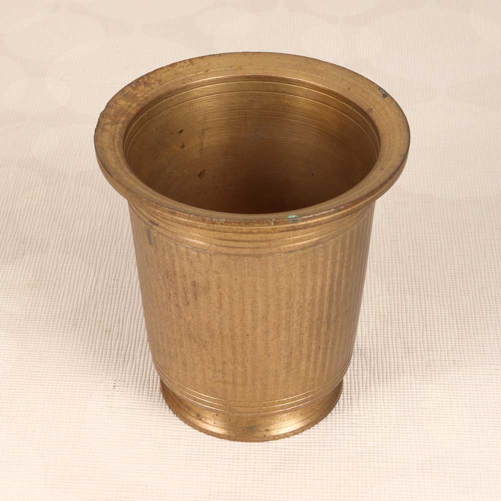Immerse yourself in spiritual beauty with this vintage brass holy water cup featuring intricate South Indian art. Its detailed motifs reflect centuries of craftsmanship, while the understated brown finish provides a subtle elegance. Use this cup to hold sacred water on your home altar or puja mandir, providing convenient access during prayers and rituals. Or fill with fresh flowers to uplift any room with peaceful, spiritual energy. Cherish this cup as a beloved treasure, with solid brass construction that will last for generations. Let its graceful presence open your heart and deepen your devotion.