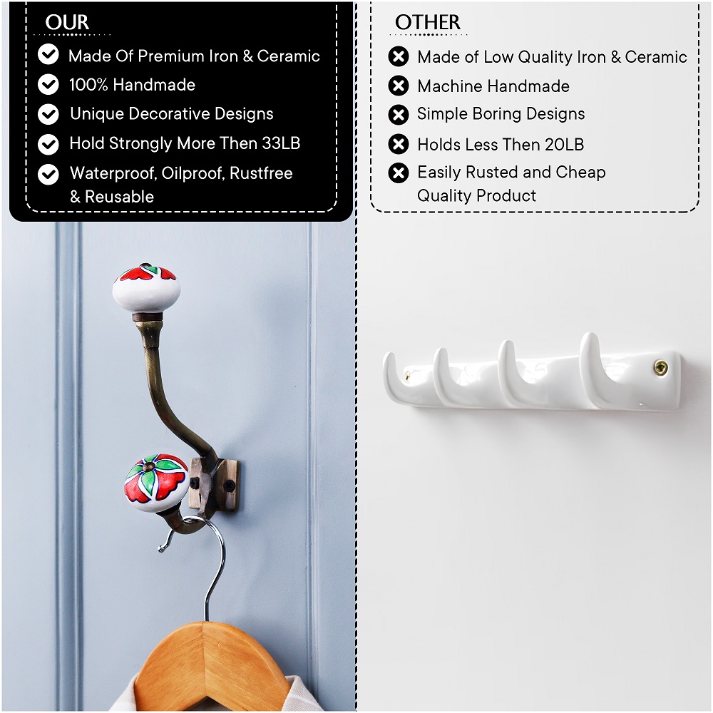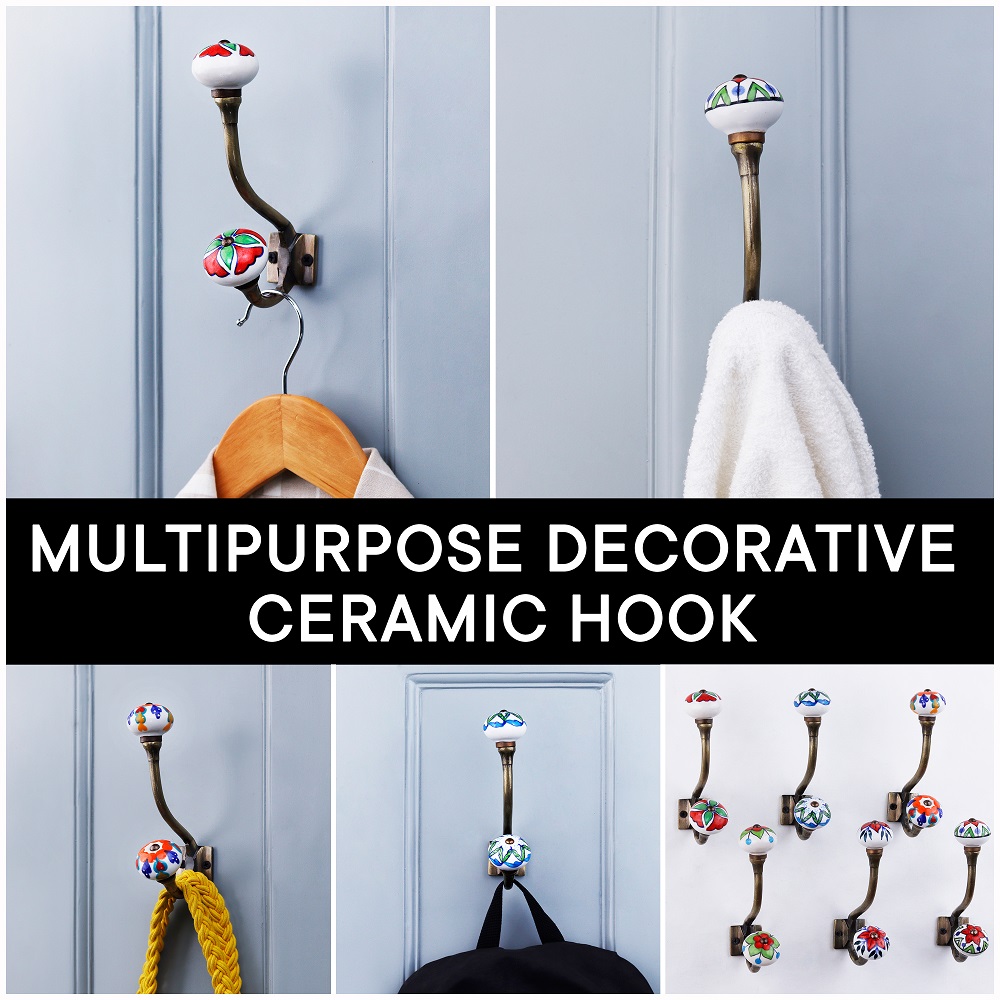 Decorative Ceramic Iron Wall Hooks 6 Pieces. When Put on Wall or Cabinet It Gives A Sturdy Look. This Hook is Strong Enough to Hold Your Cloths, Keys, Tea Cups, Coffee Mugs, Hand Towels Etc