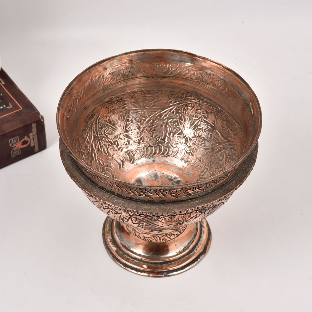 Elevate your tablescape with the captivating allure of this Vintage Copper Bowl with Stand. Crafted with meticulous Kashmiri Islamic artistry, this stunning piece is a true feast for the senses. Imagine the warm, gleaming glow of this copper bowl gracing your dining table or living room. More than just a functional piece, it's a work of art that will elevate the ambiance of any space. The engraved design, with its swirling patterns and intricate details, pays homage to the centuries-old artistry of Kashmiri Islamic craftsmen. Whether you're a collector of fine home decor or simply seeking to add a touch of timeless elegance to your space, this Vintage Copper Bowl is an investment that will be cherished for years to come. Elevate your everyday with this stunning, one-of-a-kind piece that effortlessly blends form and function.