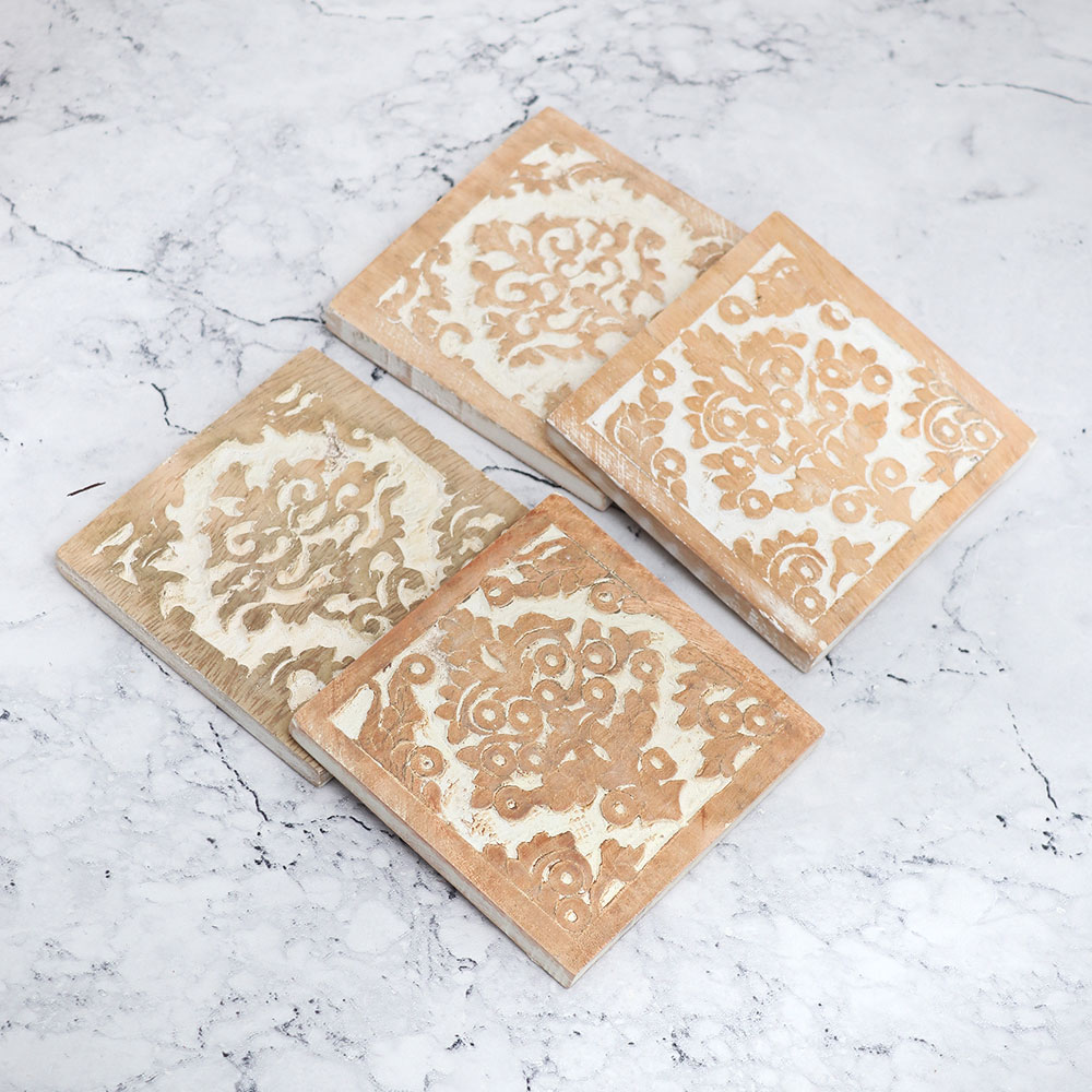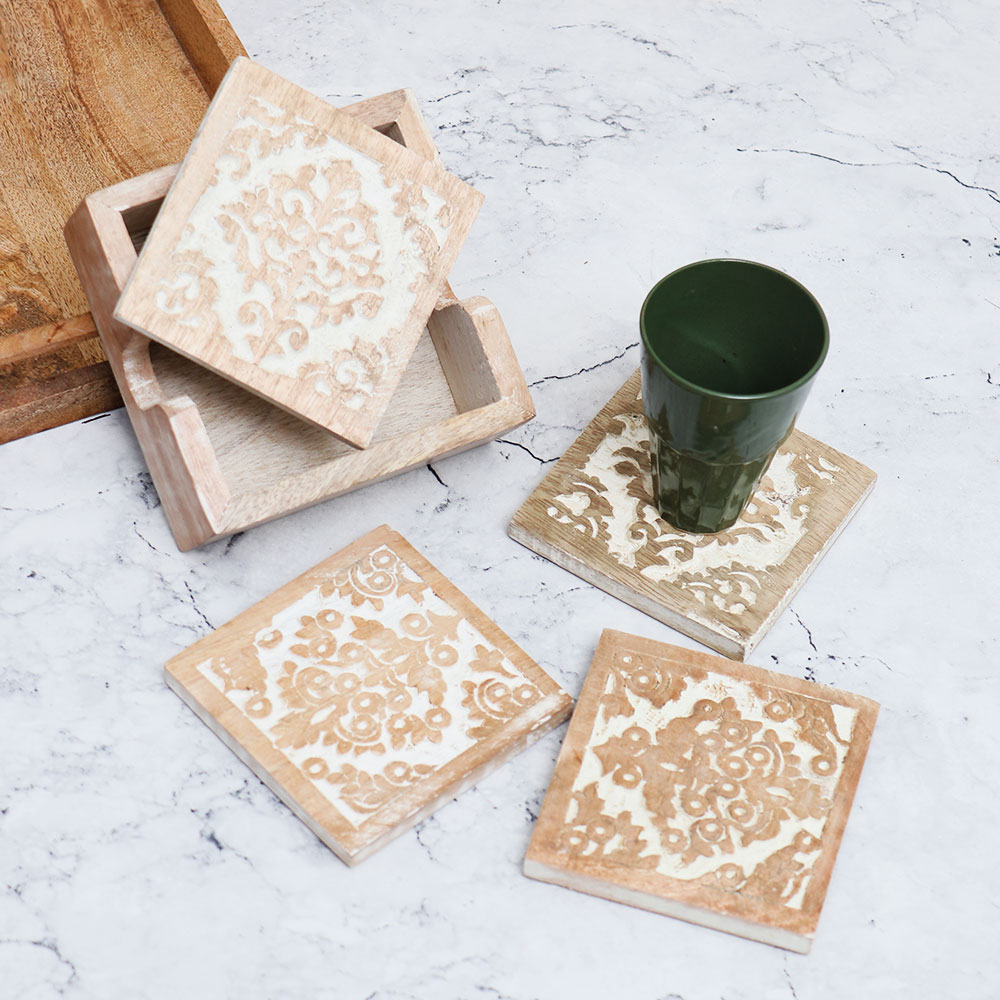 An exquisite Pack of 4 wooden coaster sets which is handcrafted with utmost precision by highly skilled and experienced Indian craftsmen. These coasters are made from the finest quality wood, ensuring durability and a touch of elegance to any space. With their square shape and stunning brown and white design, they effortlessly blend with any decor, adding a timeless charm to your home or office. Each coaster features a unique antique finish, giving it a rustic yet refined appeal. Not only are these coasters a practical solution to protect your surfaces from water, tea, juice, or coffee stains, but they also serve as striking decorative pieces in their own right. Place them in your living room, dining area, or even your workplace, and let their artistic craftsmanship elevate the ambiance. These handcrafted wooden coaster sets make an exceptional gift for your loved fours on special or festive occasions. Their versatility allows them to be used in various settings such as restaurants, hotels, cafes, and more.