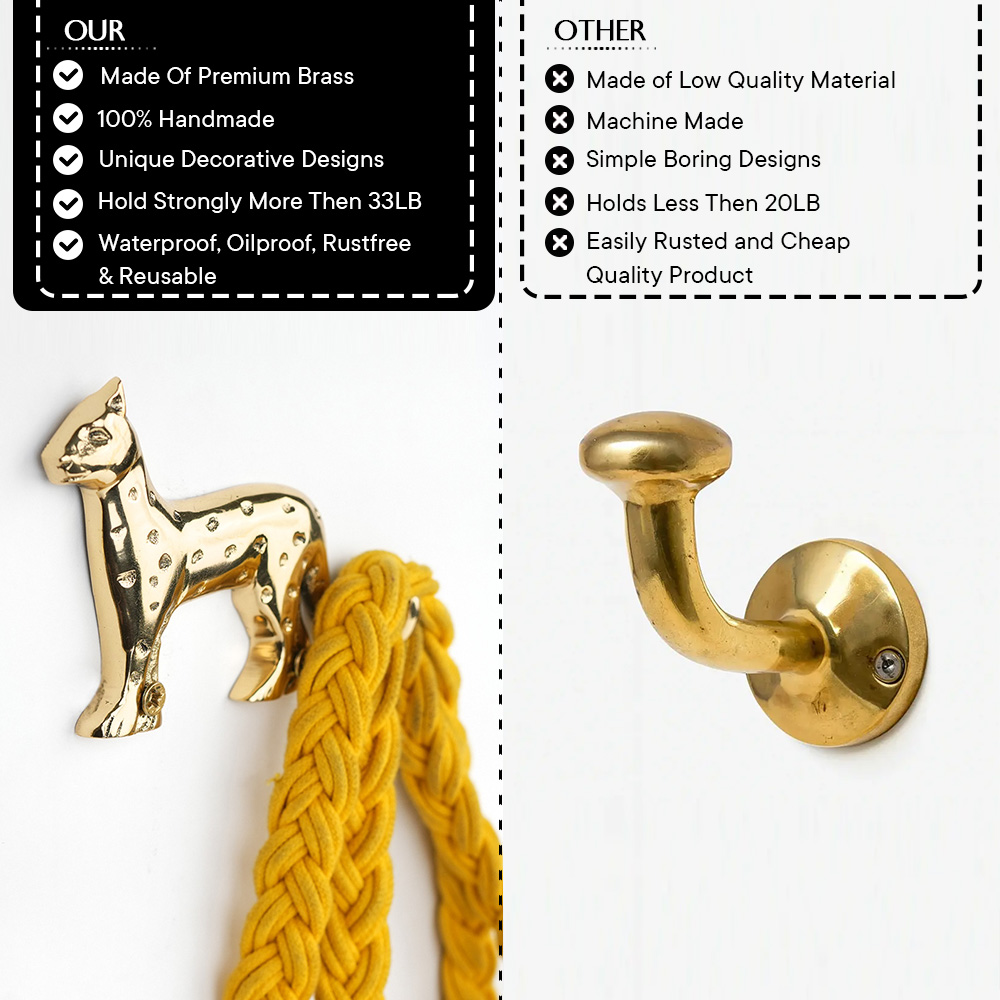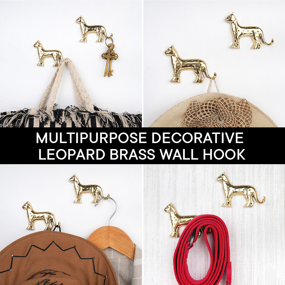 Add a bold and artistic statement to your interiors with this handcrafted brass wall hook featuring a leopard-inspired design. Made from solid brass, this wall hook offers excellent strength, durability, and a rich golden finish that enhances any space. The detailed animal form with textured accents makes it both functional and decorative, perfect for homes that appreciate unique dcor elements. Ideal for hanging clothes, towels, bags, scarves, keys, or accessories, this hook works beautifully in bedrooms, bathrooms, entryways, living rooms, and offices. Its sturdy construction ensures long-lasting performance, while the premium finish gives it a timeless appeal that complements modern, vintage, and eclectic interiors.