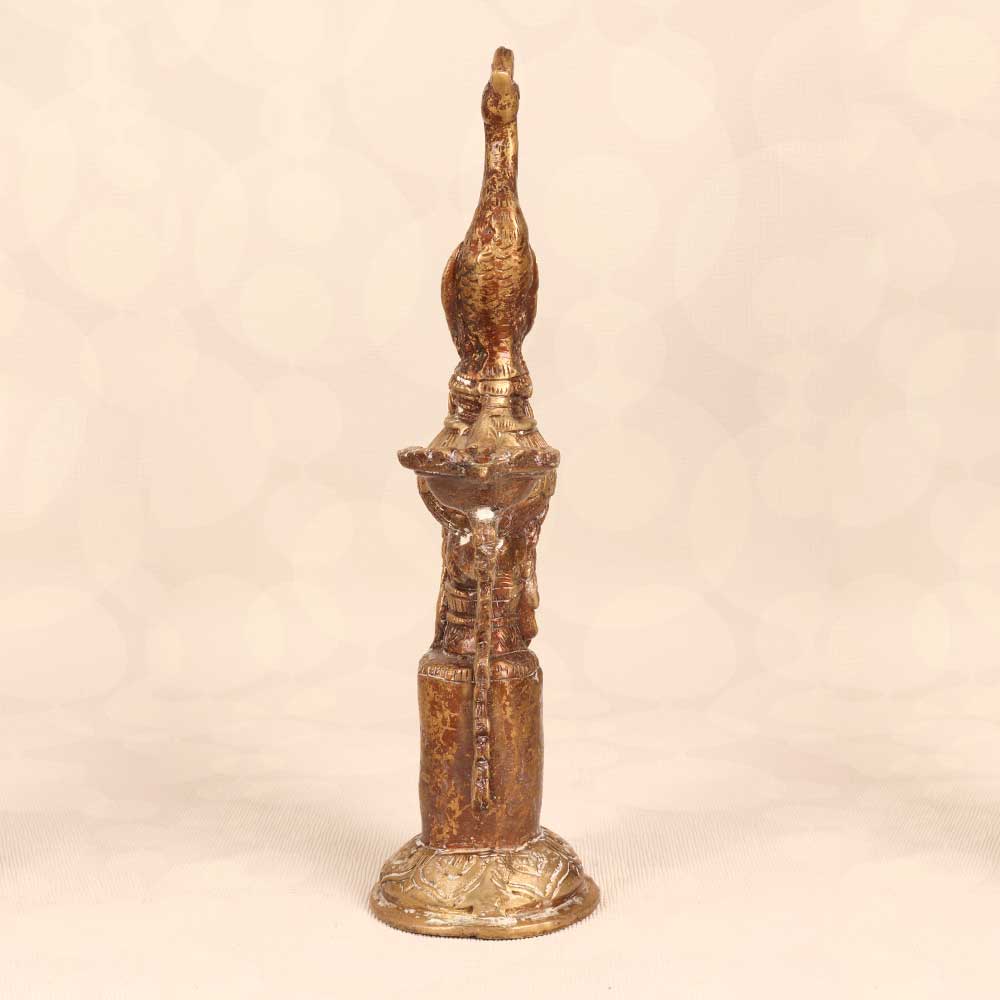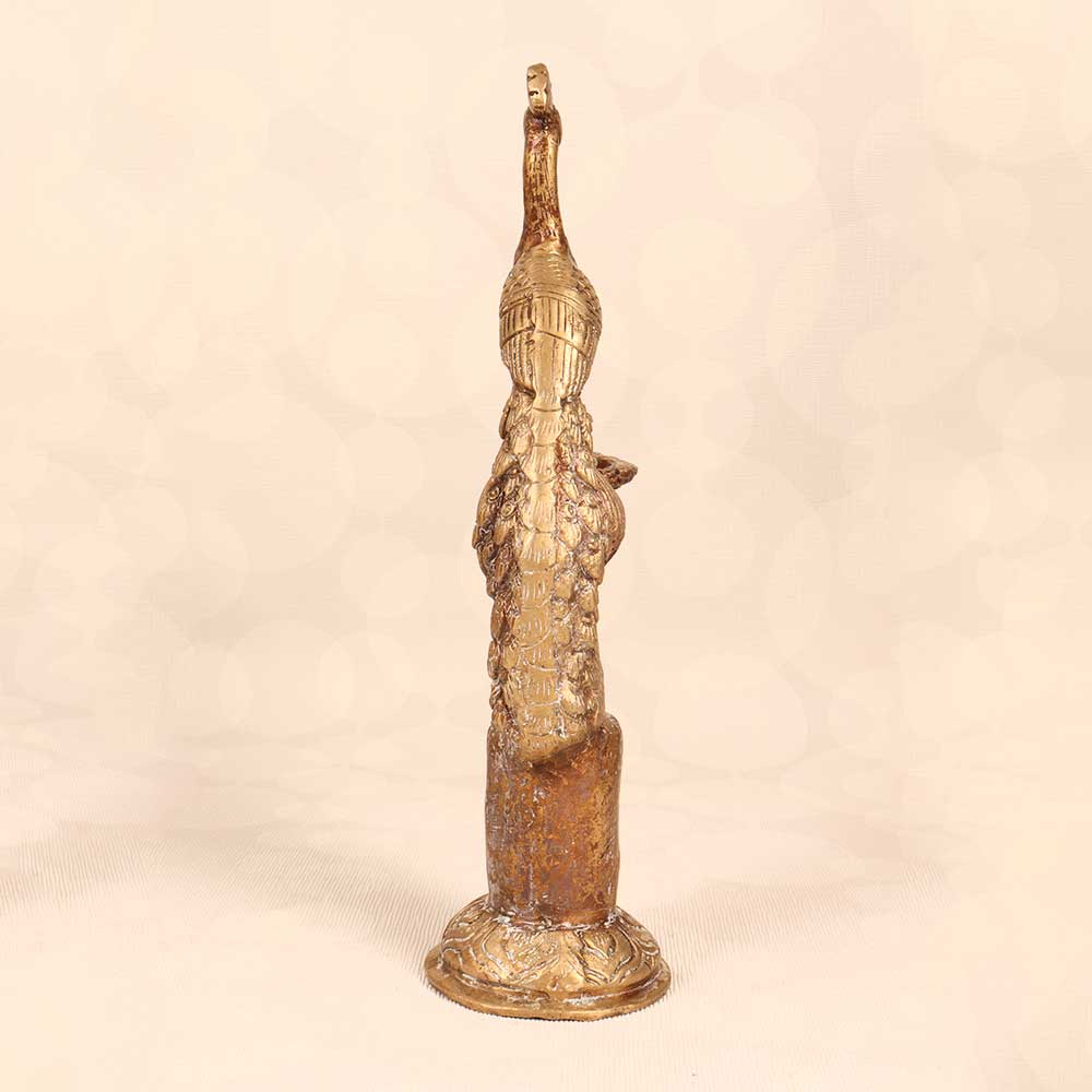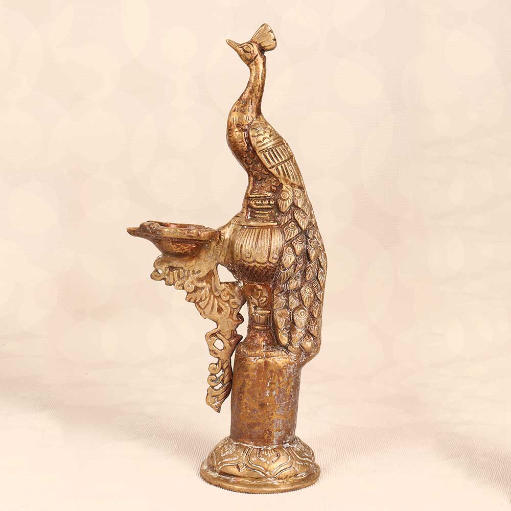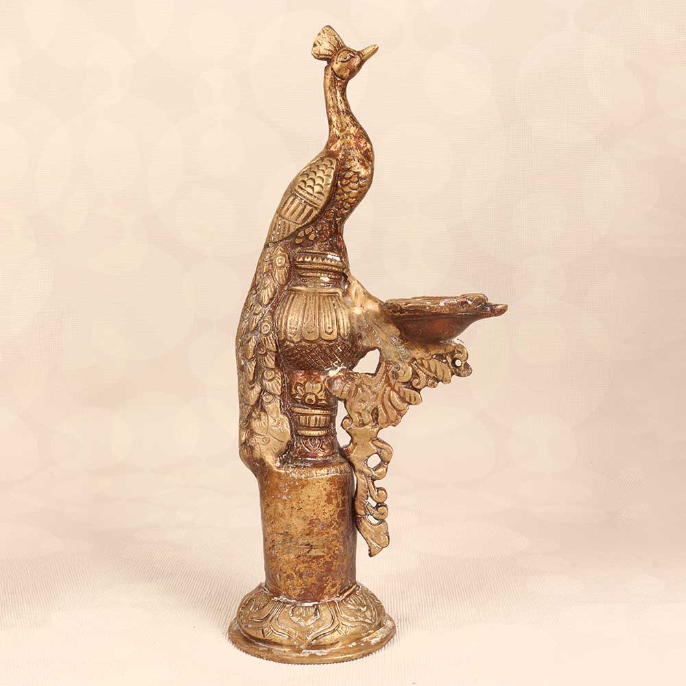 Radiate the mystical allure of India in your home with the Brass Peacock Oil Lamp. This vintage-style lamp features a regal peacock design handcrafted from brass, perched gracefully atop a sturdy weighted base. Its tail feathers fan out to hold the glass chimney, coming to life when lit to create a warm, welcoming glow. When lit, the lamp emanates ambiance and old-world charm. The peacock design seems to preen and shimmer, its plumage catching the firelight. The brass body adds exotic flair reminiscent of Indian style. Ideal for those seeking to infuse their home with grandeur and mystery, this lamp brings the essence of India to your decor. The peacock motif and oil lamp design create an air of regality and elegance. Let its mystical glow and exotic style illuminate your rooms with vintage allure. The Brass Peacock Oil Lamp radiates historic charm and beauty.