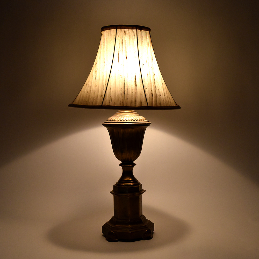 Decorative Metal Urn Mixed Metal Table Lamp With Raw Silk Shade.