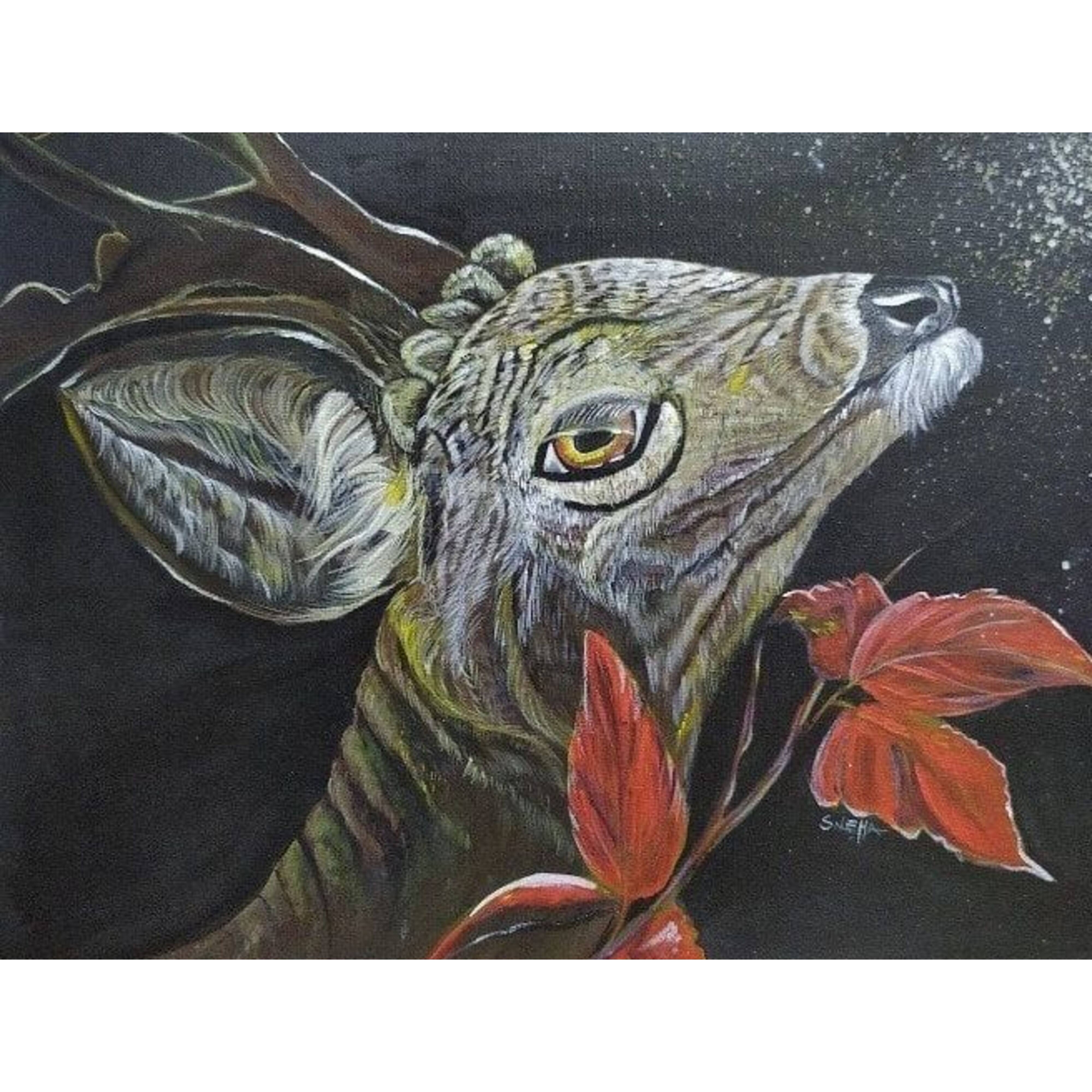 A gentle deer stands amid a cascade of red autumn leaves, its serene gaze glowing with quiet determination. Golden sprinkles shimmer like scattered stardust, illuminating the scene with a whisper of optimism. The painting captures a tender yet radiant spark of hope emerging from nature's embrace.