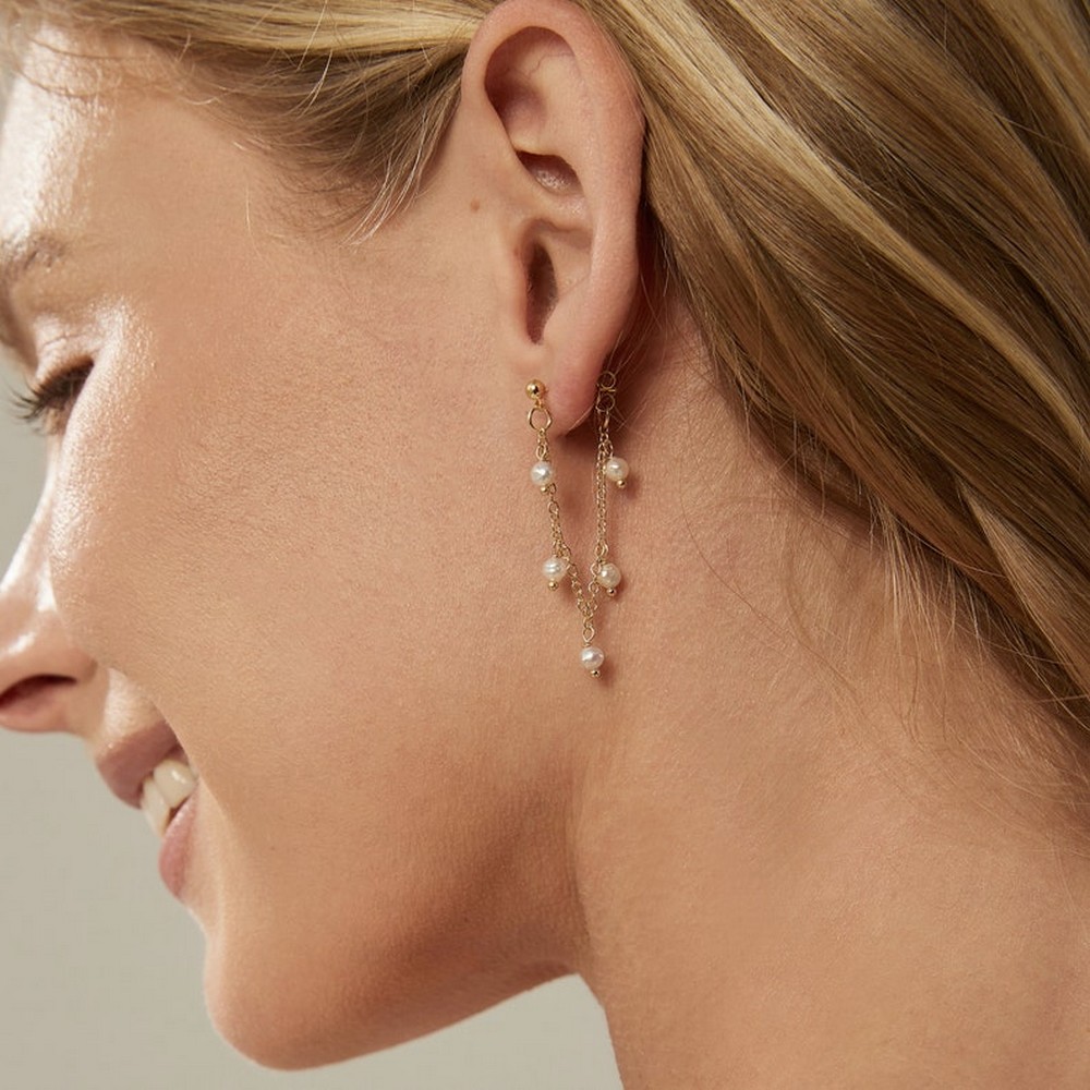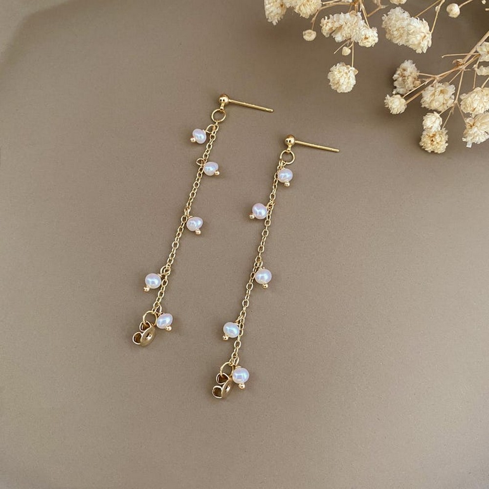 Pair these delicate pearl chain earrings with pastel dresses or crisp white shirts, and store them in a soft pouch to preserve the pearl sheen and gold polish.