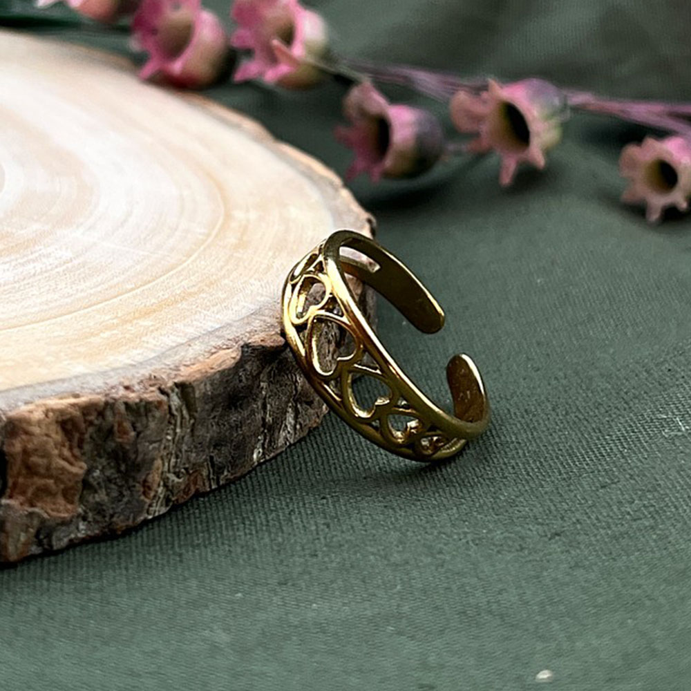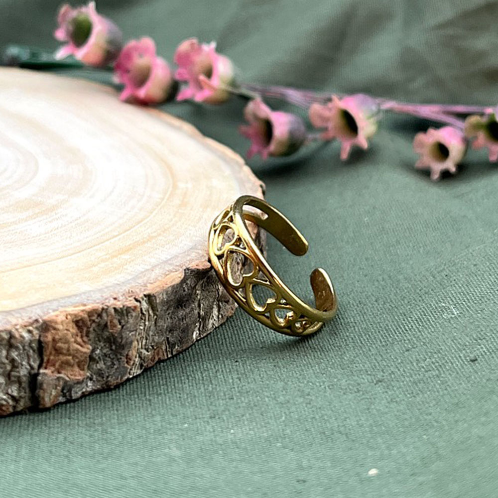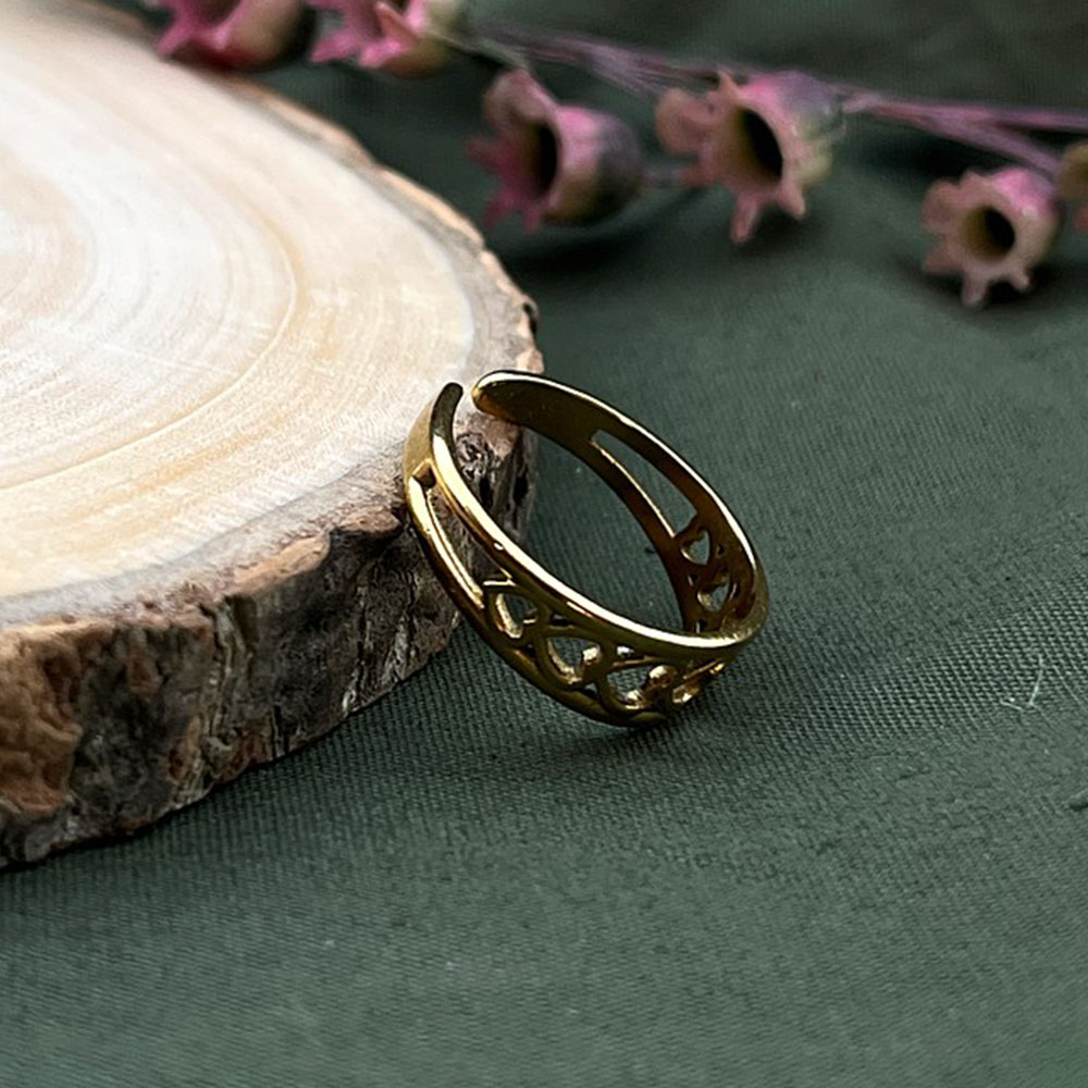 This demi fine adjustable band ring features a delicate row of heart shaped cutouts finished in radiant 18K gold plating. Made from stainless steel, it offers a comfortable open fit and a romantic touch that suits both daily styling and meaningful gifting. Lightweight and charming, it adds soft elegance to any jewelry collection. Packed and quality checked by Indianshelf.