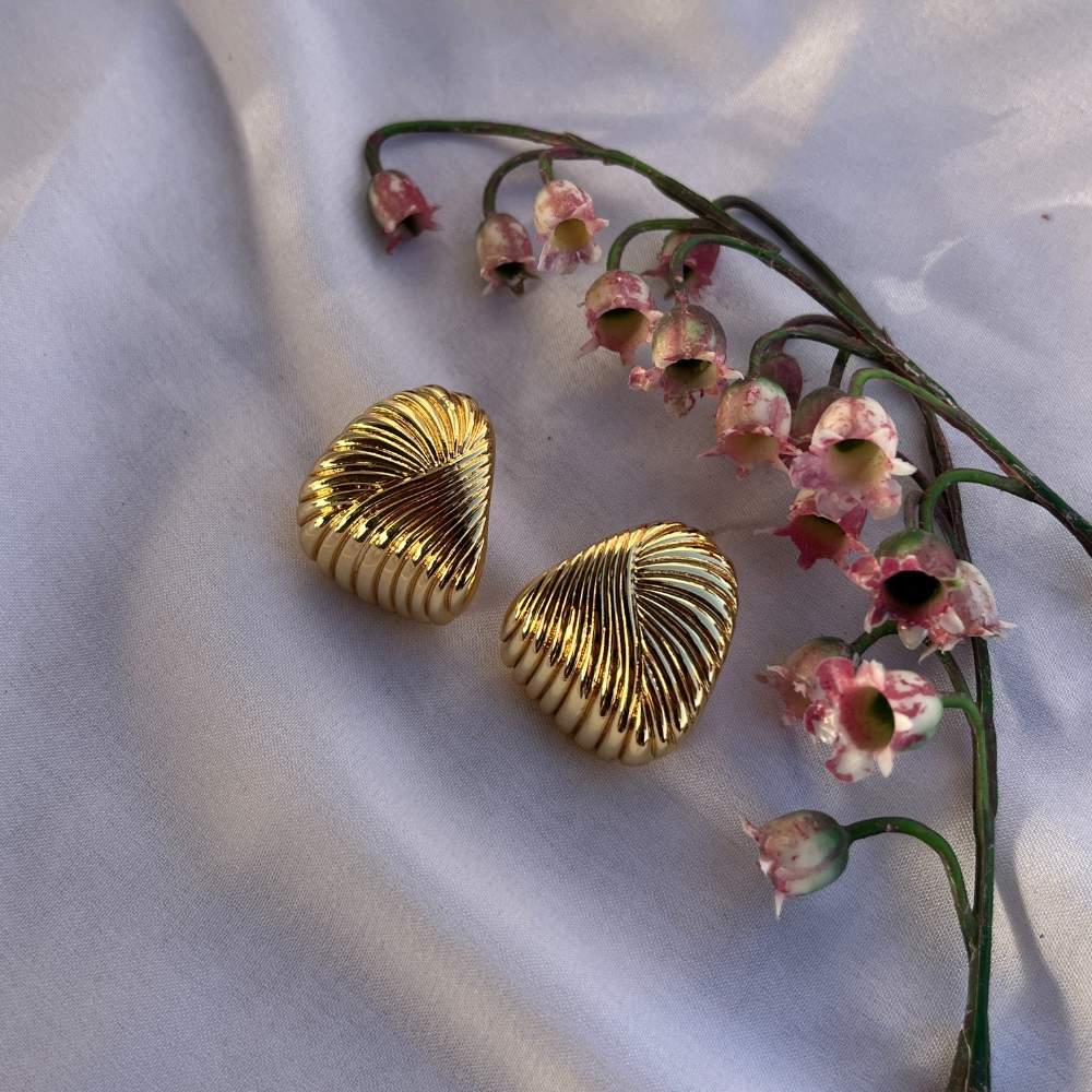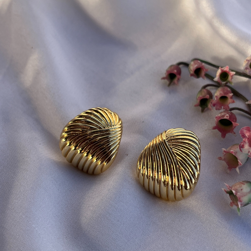 These demi fine shell inspired stud earrings capture the feel of soft shorelines with a sculpted ridged surface and warm 18K gold plating. Compact yet eye catching, they sit comfortably on the ear and suit both relaxed and refined looks. A lovely pick for sea inspired styling and gifting. Packed and quality checked by Indianshelf.