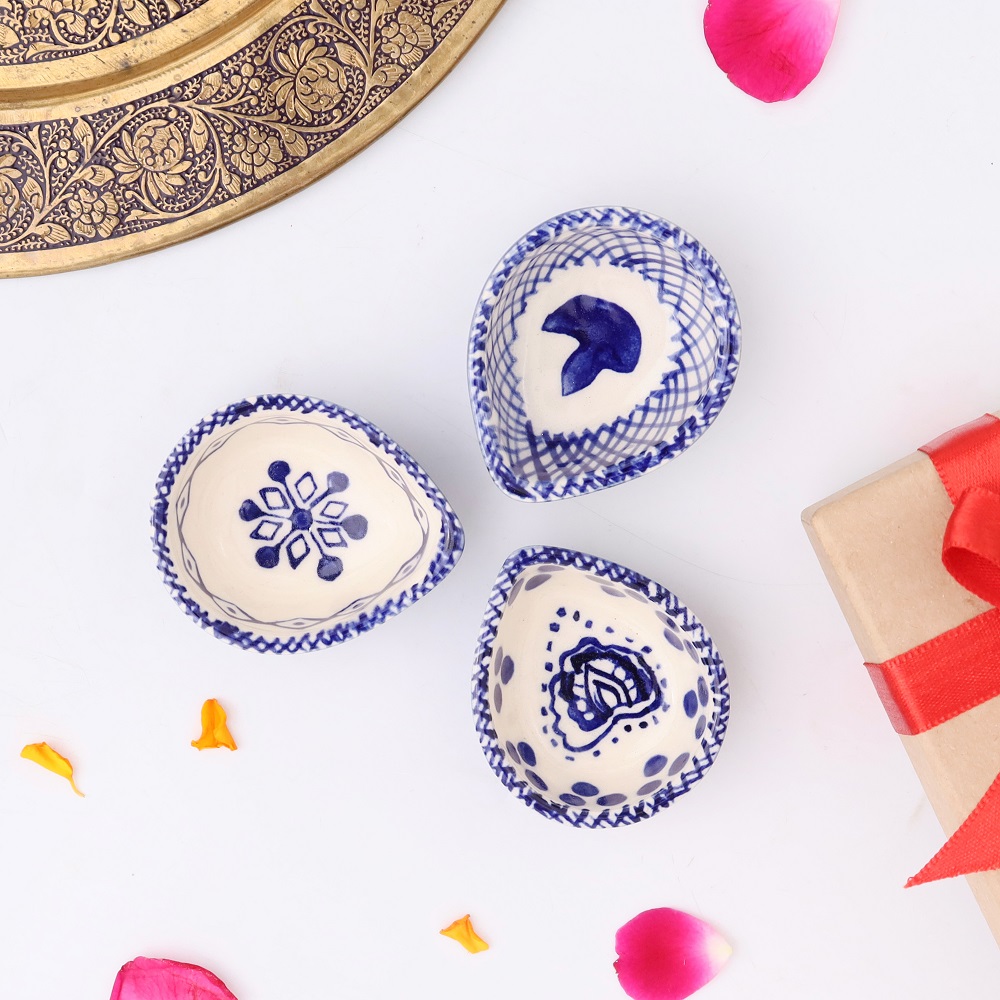 Bring the spirit of Diwali into your home with this designer blue and white ceramic Diya, a perfect blend of artistry and devotion. Handcrafted with care, its smooth ceramic finish and intricate blue detailing echo centuries of Indian festive traditions. Compact yet striking, this diya is made to illuminate your mandir, living space, or festive setup with grace and cultural charm.