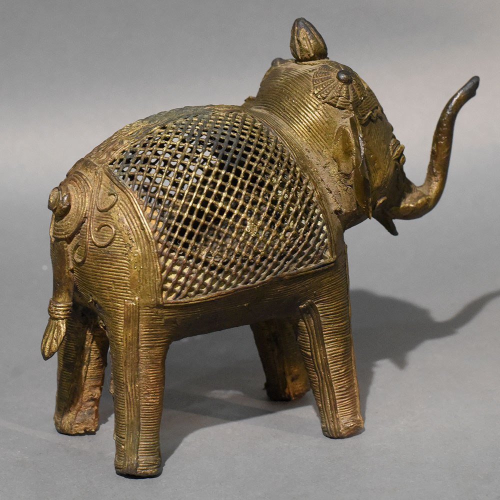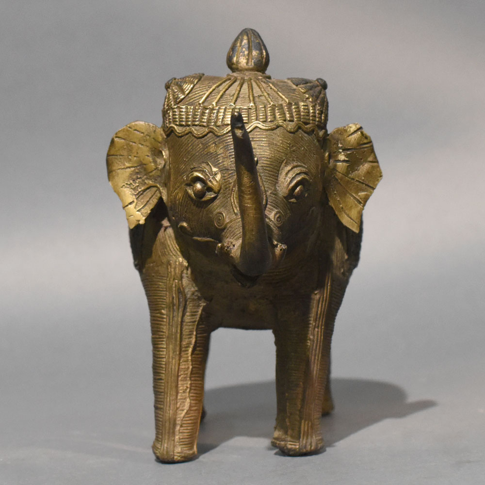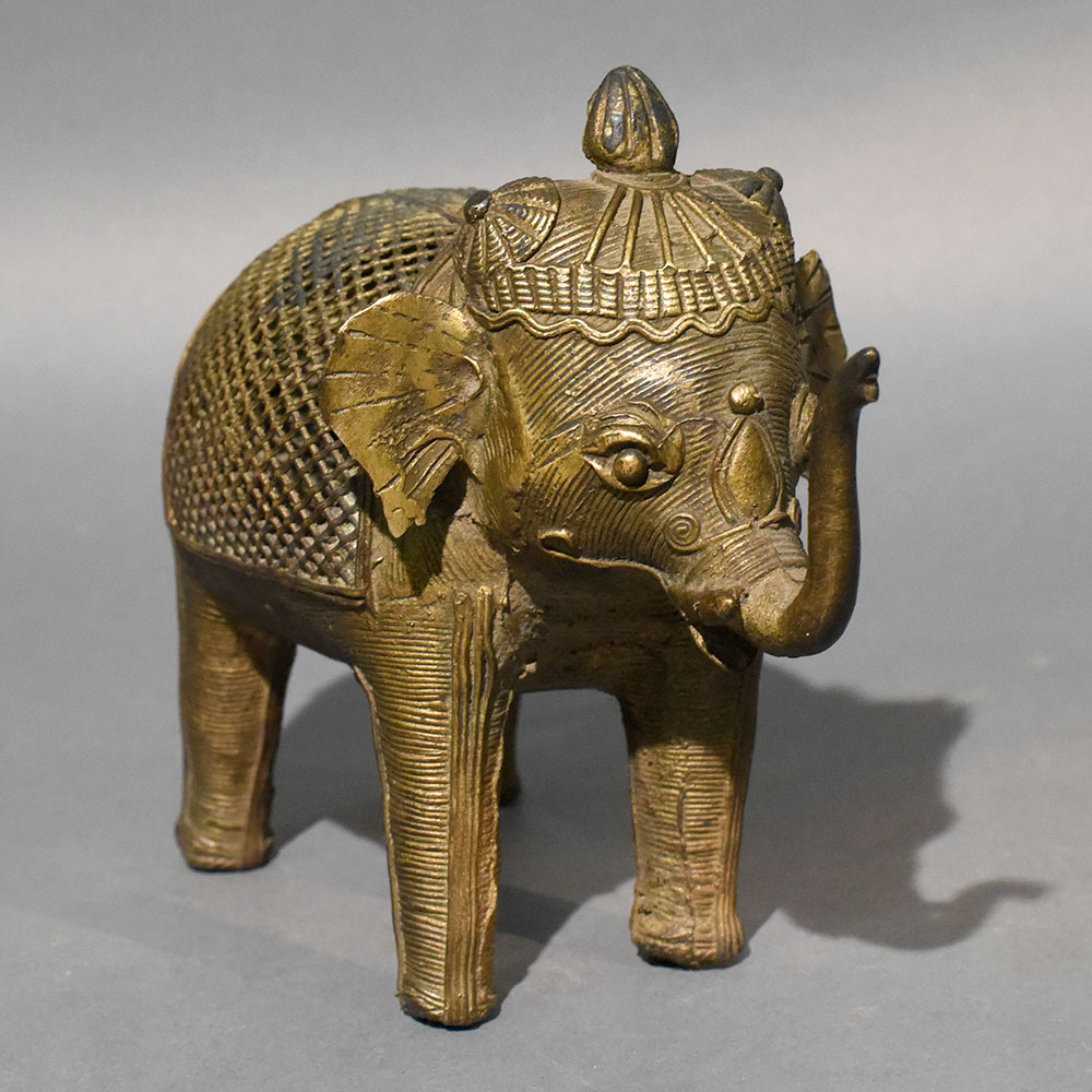 This beautifully detailed Dhokra brass elephant figurine reflects the timeless heritage of Indias tribal metal craftsmanship. The sculpture features a graceful elephant with an uplifted trunk, decorated with traditional engravings and a woven lattice pattern across its back that highlights the distinctive style of Dhokra art. In Indian symbolism, elephants represent strength, wisdom, prosperity, and protection. An elephant with a raised trunk is traditionally believed to attract positive energy and good fortune, making such sculptures a meaningful addition to homes, workspaces, and spiritual settings. The figurine is created using the ancient Dhokra lost wax casting technique, a centuries old tribal metalworking method practiced by artisans in central and eastern India. This handcrafted process produces natural textures, subtle variations, and intricate detailing that give each sculpture a unique artistic character. The elephants head features delicate decorative patterns along with a small crown like top ornament, while the ears and facial features are stylized in the folk art tradition. The textured lattice pattern covering the back adds depth and visual contrast to the sculpture, enhancing its handcrafted appeal. The antique brass finish accentuates the engraved detailing and gives the piece a warm rustic tone that suits traditional, ethnic, and heritage inspired interiors. Perfect for display on shelves, desks, or decorative consoles, this Dhokra elephant figurine brings cultural richness and artistic craftsmanship into any space. Each piece is handmade, so slight variations in texture and finish naturally occur.