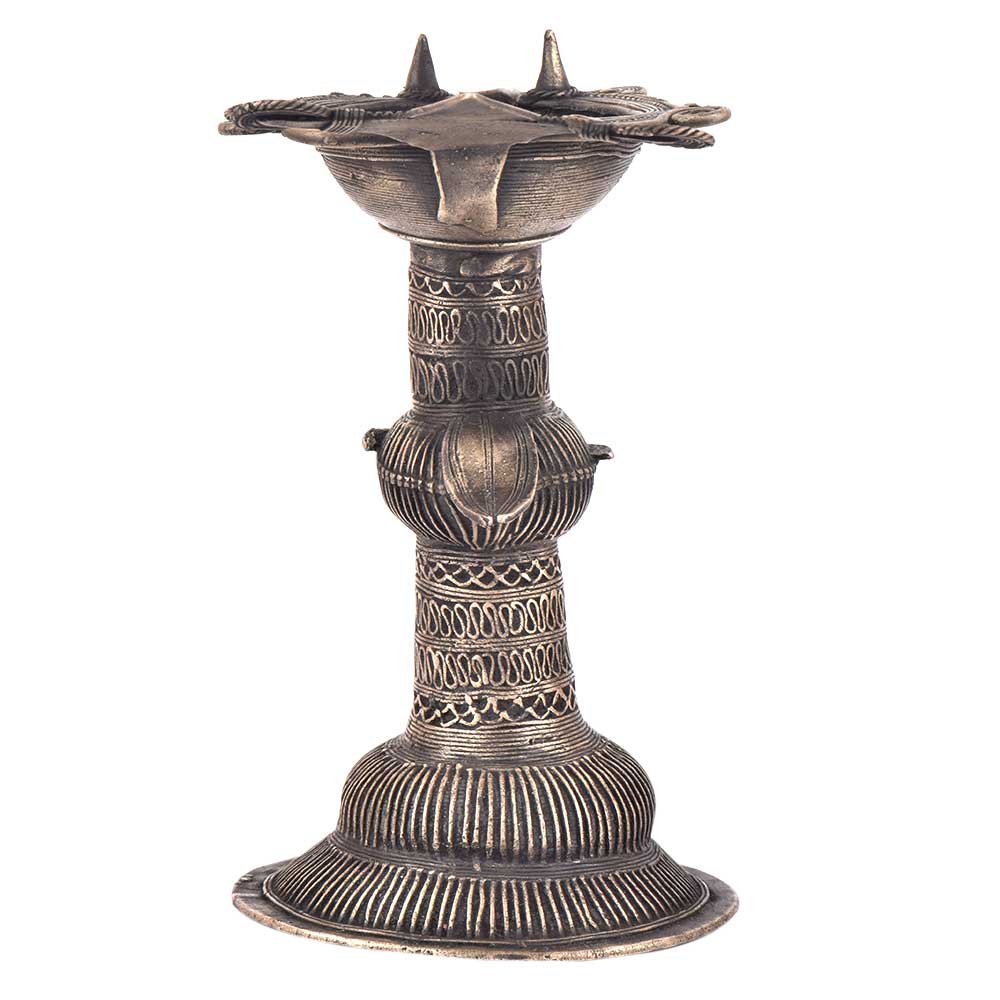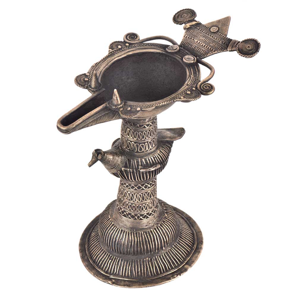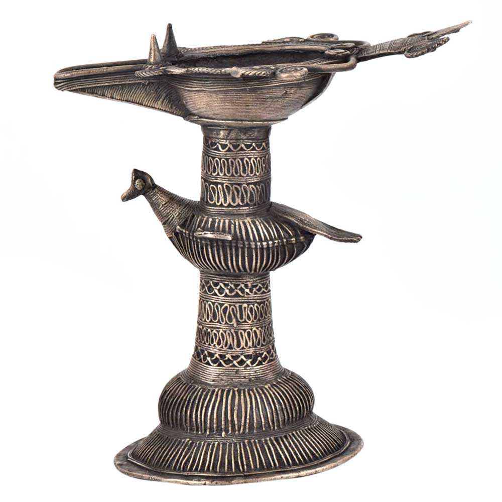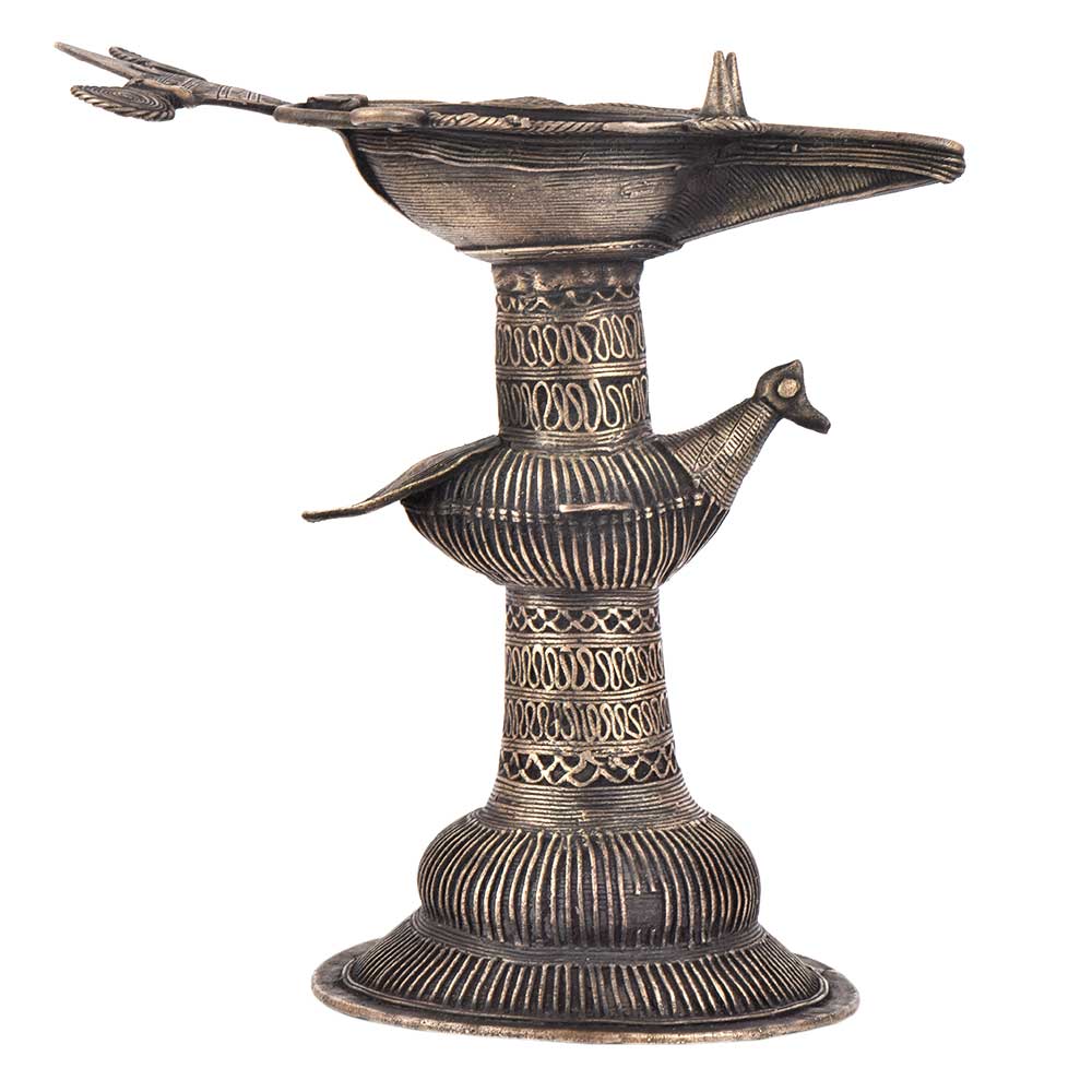Handcrafted using old lost wax technique primarily practiced in Orrisa and West Bengals by the local or tribal artisans. In this technique the molten wax is poured into desired clay mould and when the wax melts the clay is broken and we get the desired metal object which is further polished to perfection. The Deep Cup Can Be Filled with Oil and Light a Cotton Wick. Diyas/ Oil Lamps are Considered Auspicious as in Hindu Religion. It is detailed with Elephant and Peacock Animals with Beautiful Details.
