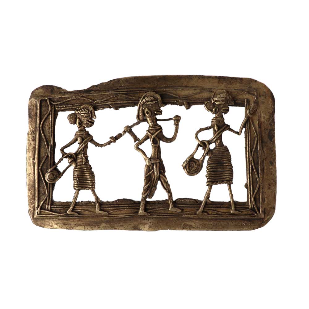 This charming brass wall hanging Dhokra Art features a farmer and two women, one of whom is holding a rope and the other a basket. The farmer is holding an axe, and they are heading to the fields. These activities are a tribal couple from the Dhokra tribe's daily routine. Decorations for the inside of homes, offices, schools, and galleries. Give it to those who are close to you.