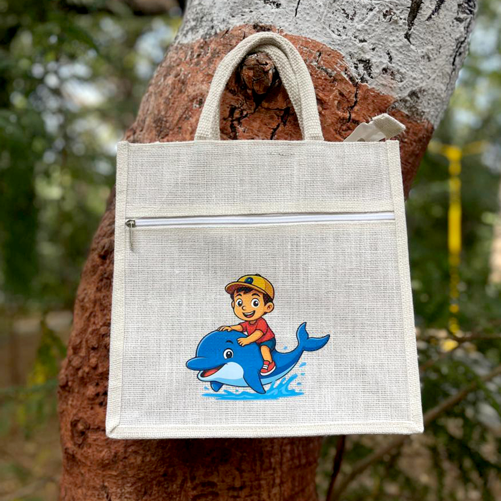 The Dolphin Adventure Zipper Jute Tote Bag blends playful illustration with everyday practicality through a structured natural jute form. Featuring a cheerful dolphin graphic paired with a secure zip closure, this tote brings together child-friendly charm, durability, and functional design for daily use.