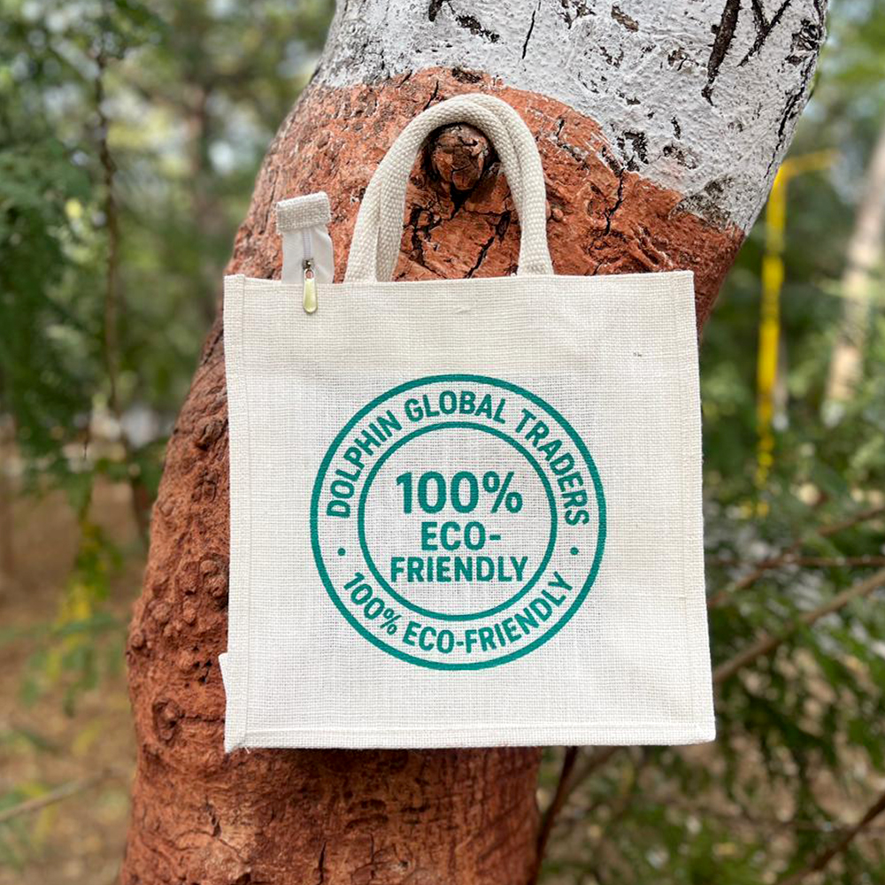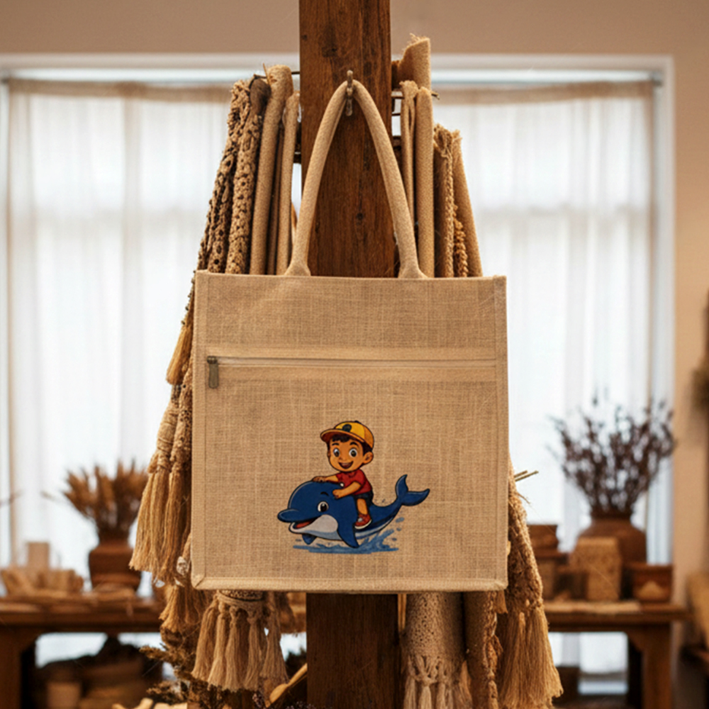 The Dolphin Adventure tote transforms a functional jute bag into a cheerful companion for daily routines. With its secure closure and friendly design, it supports reusable living while adding a sense of fun and reliability.