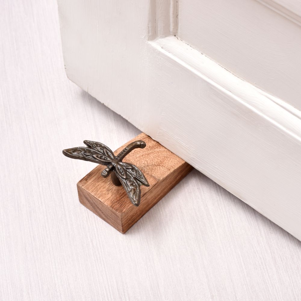Buy a Wooden Door Stopper online that is a masterpiece crafted with precision by highly skilled Indian craftsmen. This exceptional piece is made from high-quality wood, adorned with an antique brown finish that radiates elegance. The door stopper features a captivating dragonfly, handcrafted from iron in a dark finish, serving as a symbol of grace and beauty. Designed to impress, this door stopper not only adds a touch of sophistication to any space but also serves a practical purpose. Its rubber grip underneath ensures a firm hold, preventing unwanted slips and securely holding doors in place. It serves as an ideal gift for your family, friends or relatives on special occasions, such as housewarmings, symbolizing blessings and good fortune.