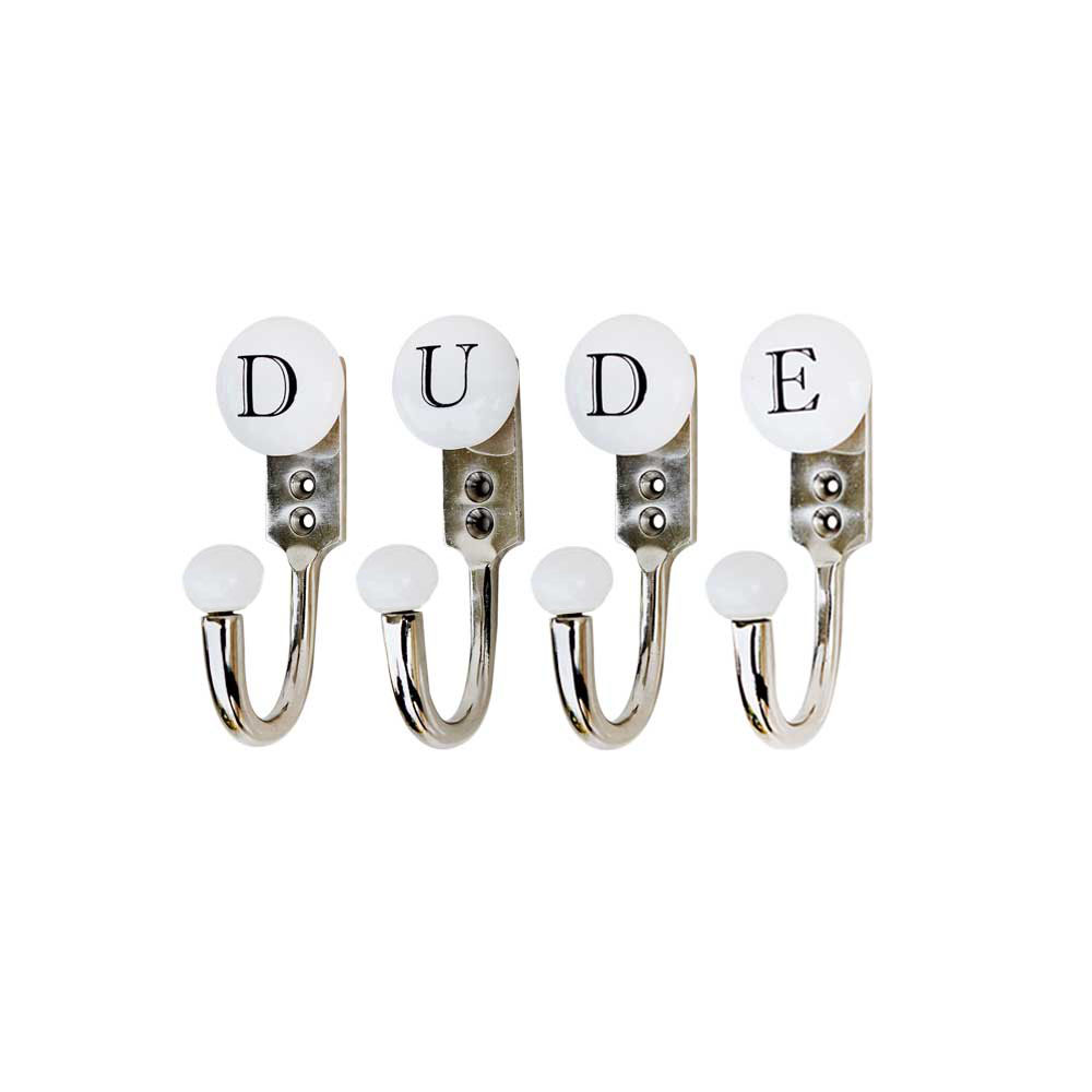 DUDE white and black alphabet hooks (combo pack). When put on wall or cabinet it is an art in itself. This hook is strong enough to hold your keys, tea cups, hand towels, cloths etc.