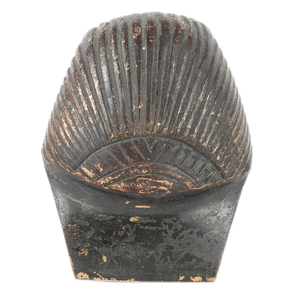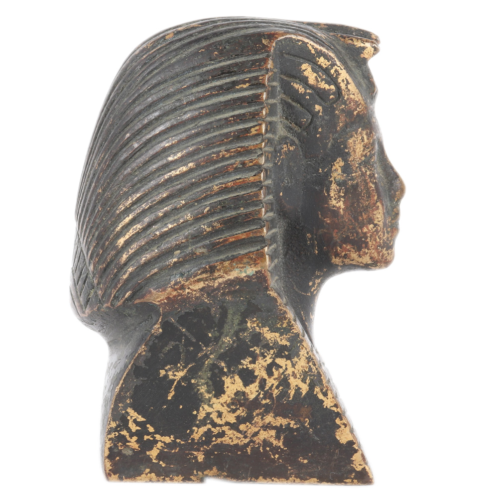 With this brass bust of King Tut figure, you can relive one of Egypt's most celebrated and powerful dynasties. King Tut, adorned in his golden mask, sits in his coffin tomb beneath the protection of a pyramid. This figure was expertly carved to depict this ancient king.