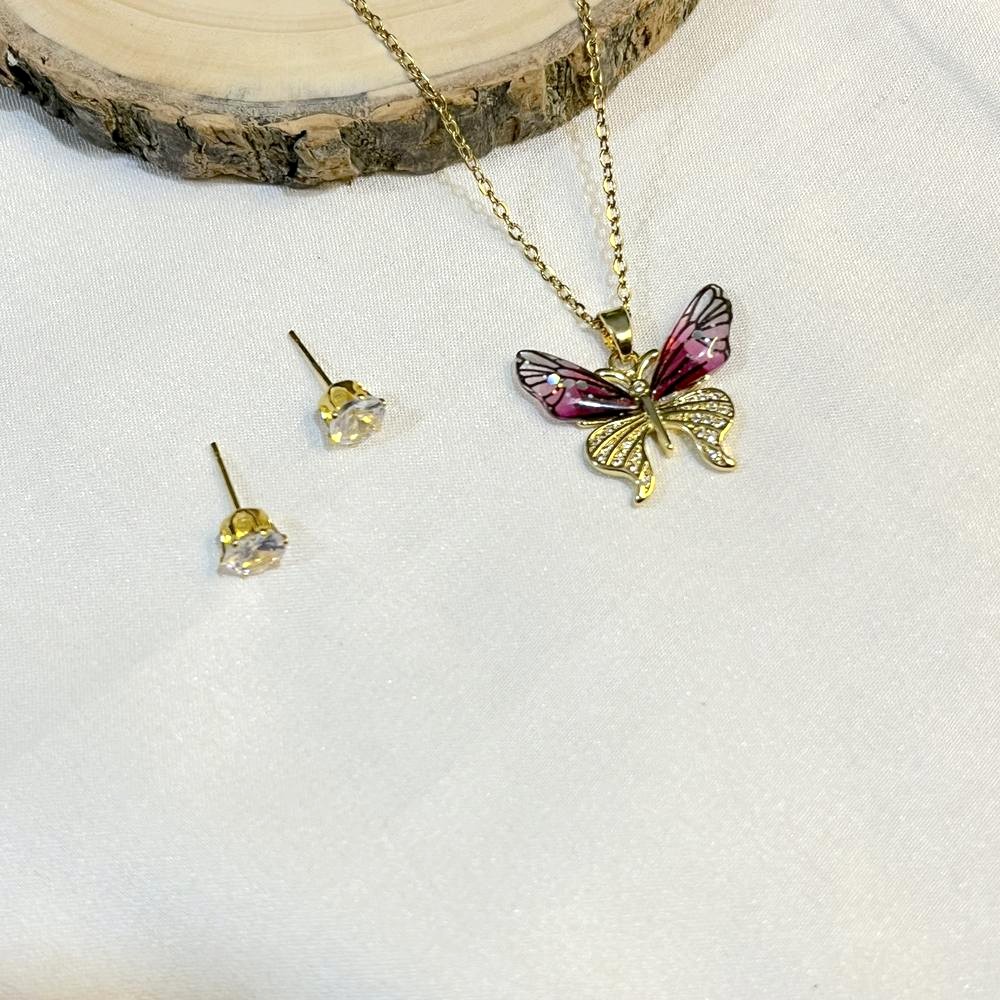 The ruby enamel butterfly pendant brings lively color, while the zirconia studs add refined brilliance for a balanced and feminine finish.