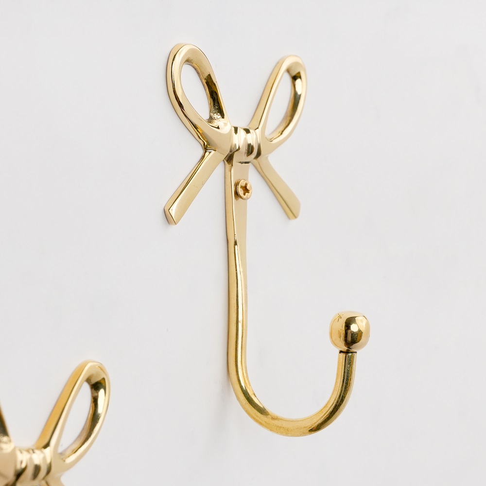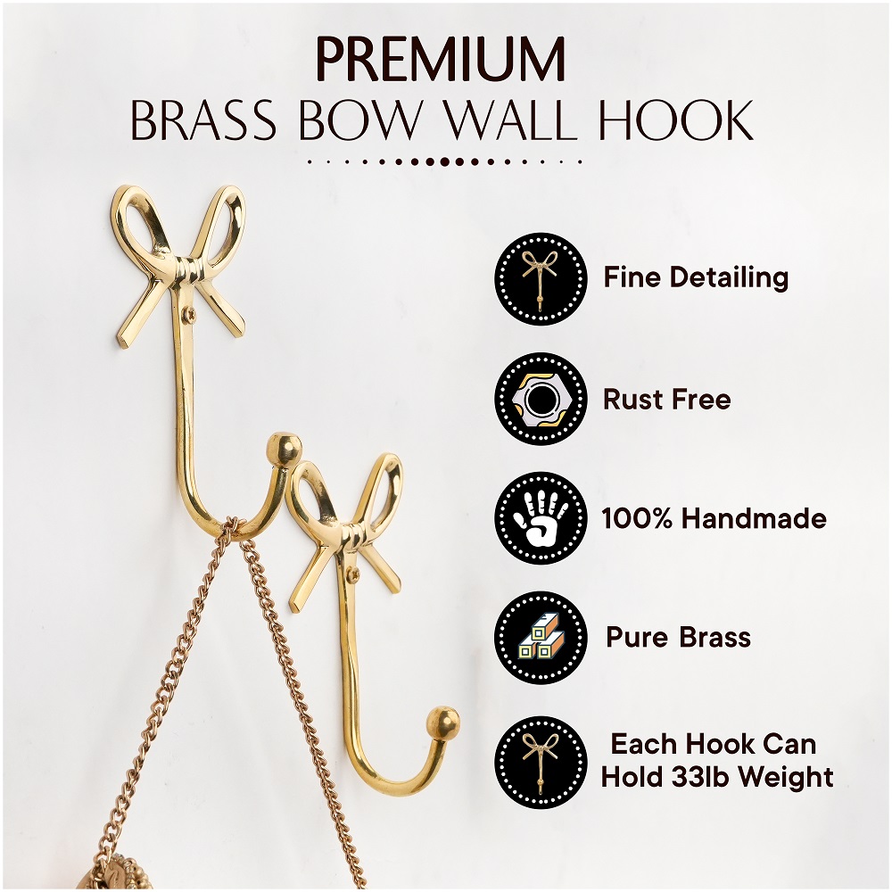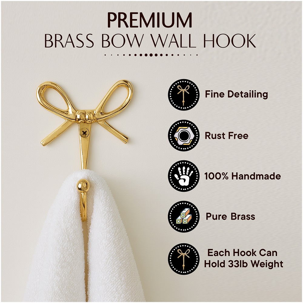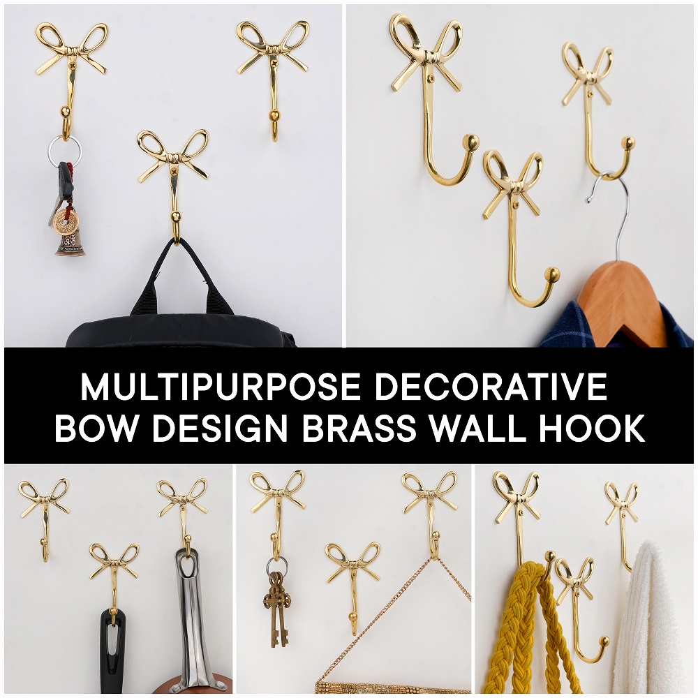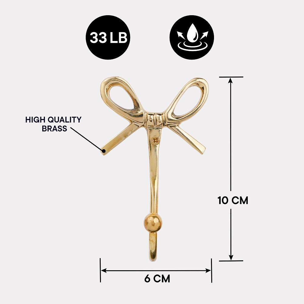 Add a charming touch of elegance to your home with this Bow Design Brass Wall Hooks. Handcrafted from high-quality solid brass, this hook combines beauty with functionality. The graceful bow shape adds a hint of vintage charm while the polished golden finish enhances your wall dcor. Perfect for entryways, bedrooms, bathrooms, or dressing areas, its ideal for hanging bags, scarves, coats, jewelry, or towels with ease. Designed to be both sturdy and stylish, this brass hook blends effortlessly with modern and classic interiors alike.