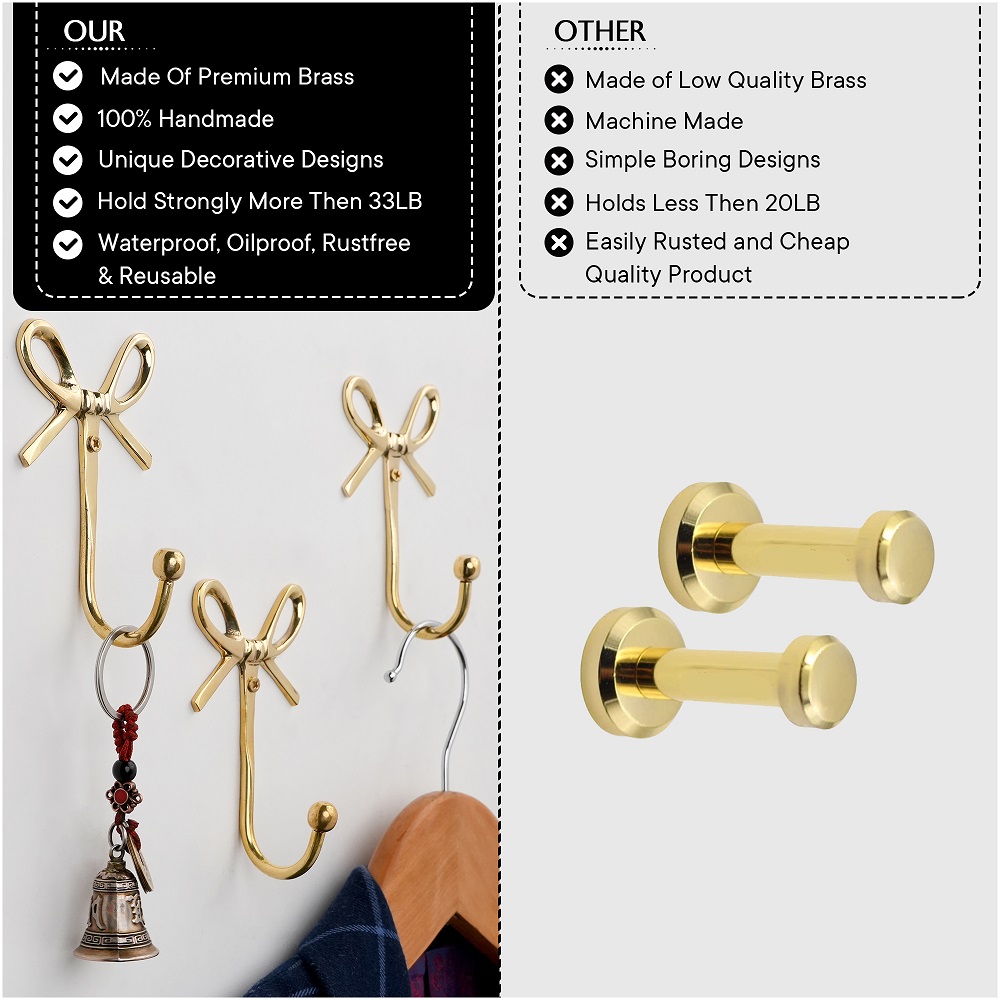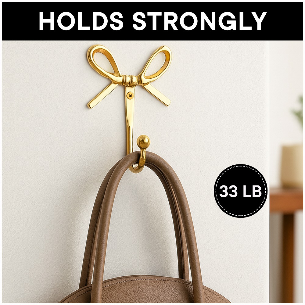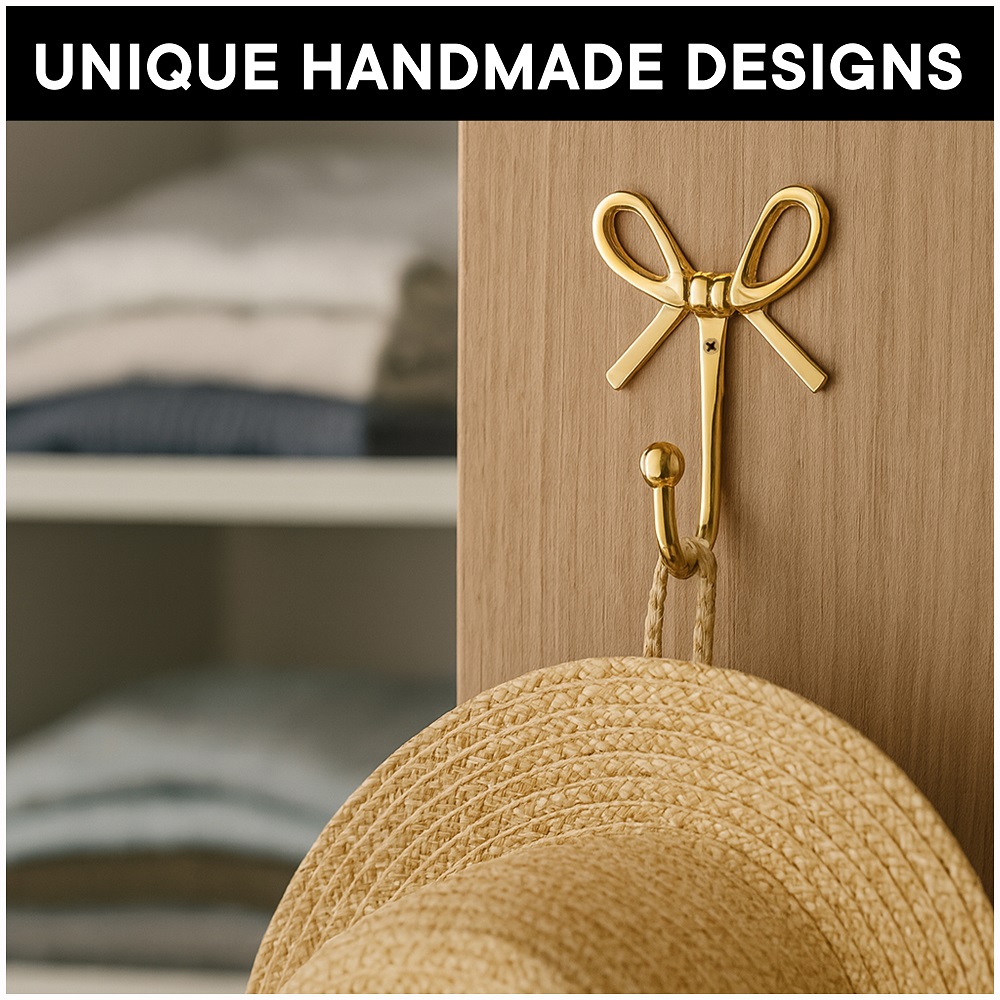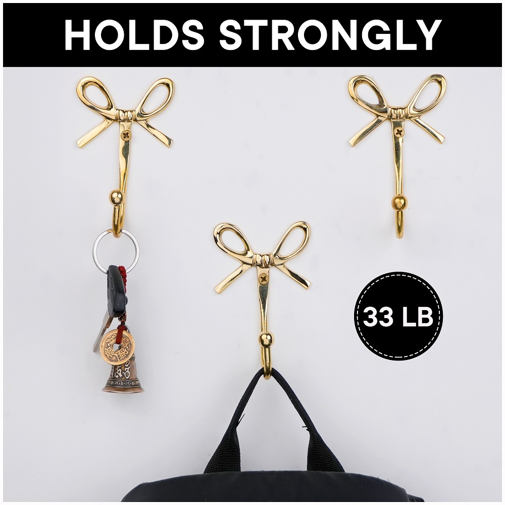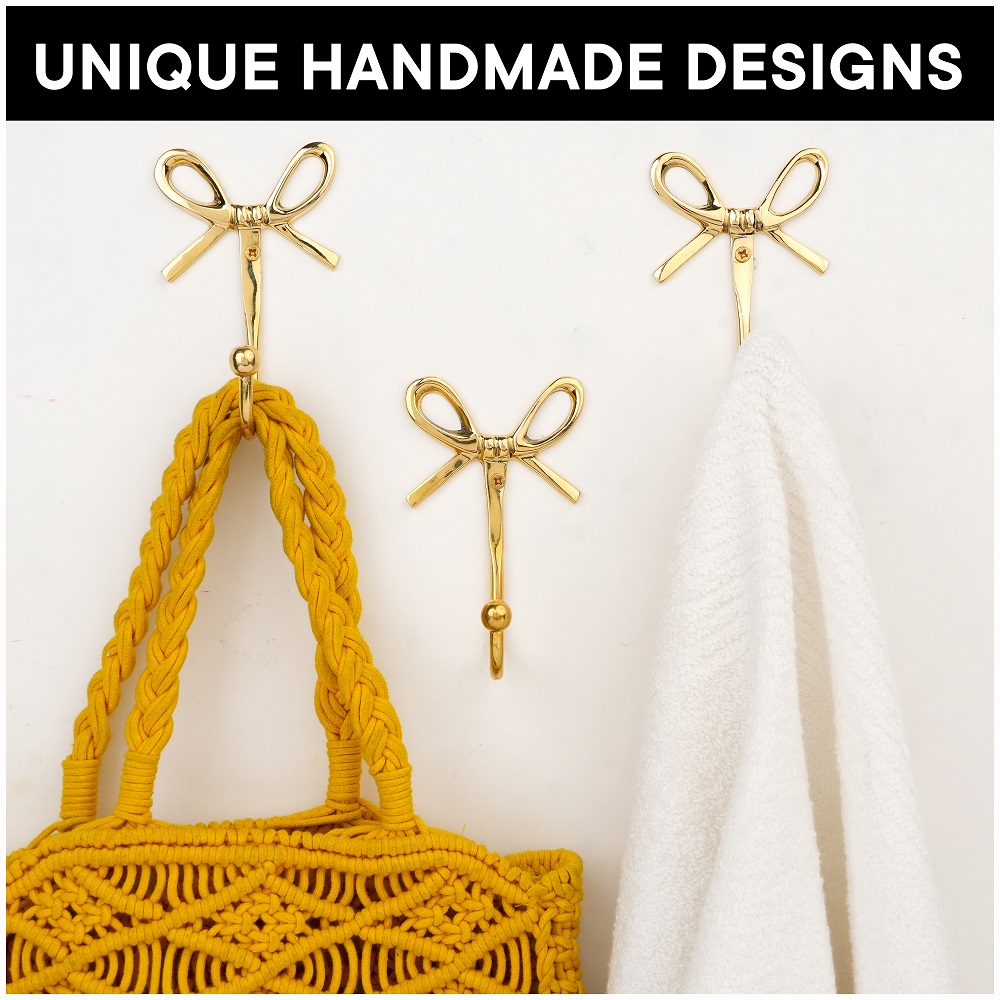 Add a charming touch of elegance to your home with this Bow Design Brass Wall Hooks. Handcrafted from high-quality solid brass, this hook combines beauty with functionality. The graceful bow shape adds a hint of vintage charm while the polished golden finish enhances your wall dcor. Perfect for entryways, bedrooms, bathrooms, or dressing areas, its ideal for hanging bags, scarves, coats, jewelry, or towels with ease. Designed to be both sturdy and stylish, this brass hook blends effortlessly with modern and classic interiors alike.