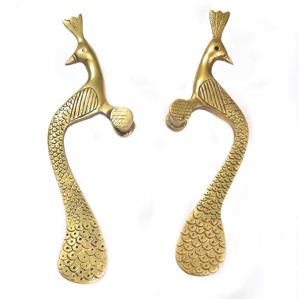 Transform plain looking wooden door into something artistic and extraordinary. This beautiful brass peacock on the either side with their body flair joining together for a large wing like appearance.