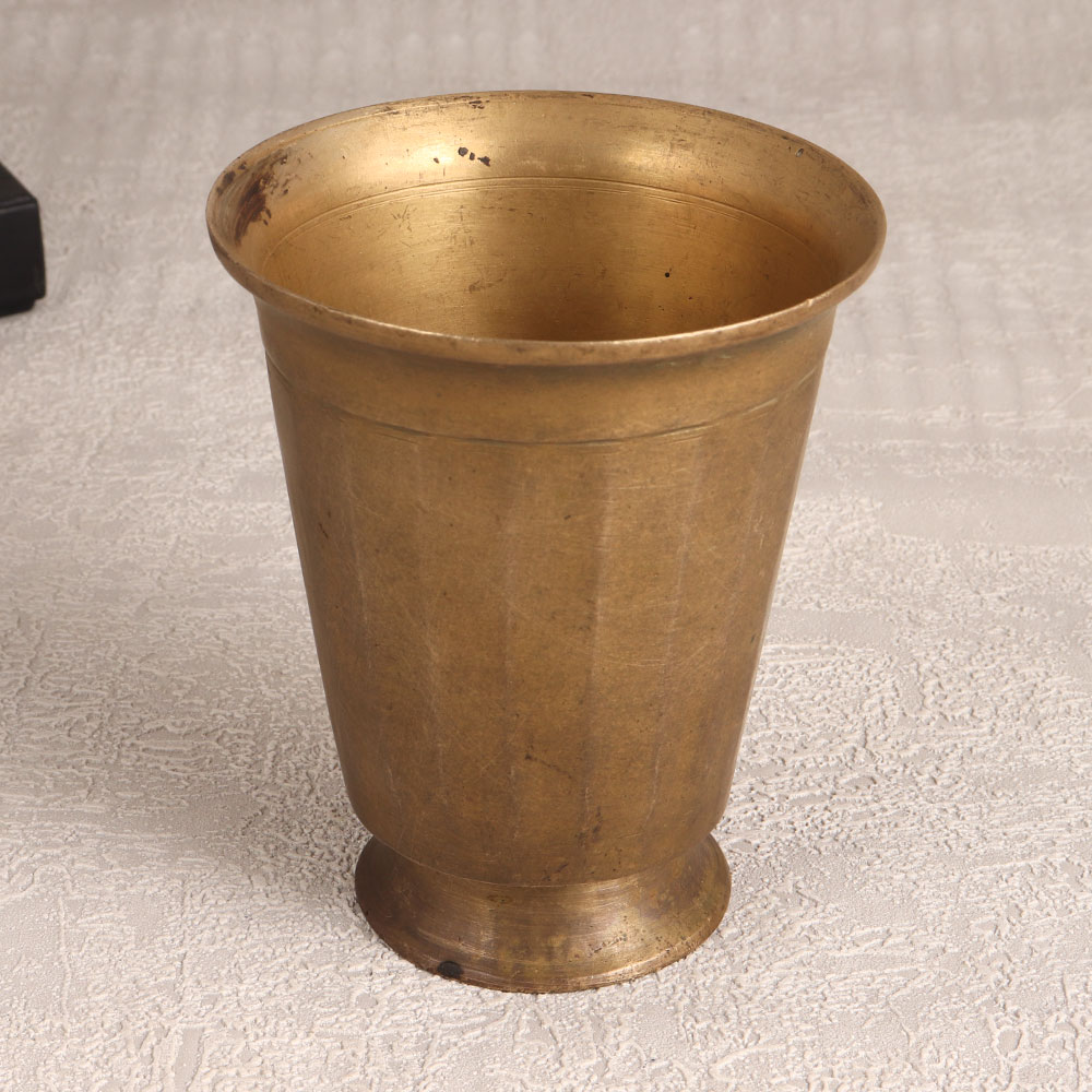 This Vintage Brass Holy Water Glass in an antique brown finish is a true masterpiece crafted by highly Indian artisans in the timeless tradition of South Indian artistry. Handmade from high-quality brass, this sacred vessel is a symbol of devotion and craftsmanship. This Holy Water Glass is not just a religious artefact but also a work of art that adds a touch of elegance to any sacred space. It serves a multitude of purposes – perfect for holding holy water during prayers, havans, or rituals. Its rich, antique brown finish adds an aura of antiquity and reverence. Versatile in its use, this holy water glass can grace your home, office, restaurant, hotel, or cafe's prayer room, enriching the atmosphere with a divine ambiance. Additionally, it can be employed as a decorative piece, adorned with fresh flowers, enhancing your space's aesthetics. Surprise your family, friends or relatives with this meaningful gift on special, festive, or auspicious occasions, symbolizing your best wishes and reverence.