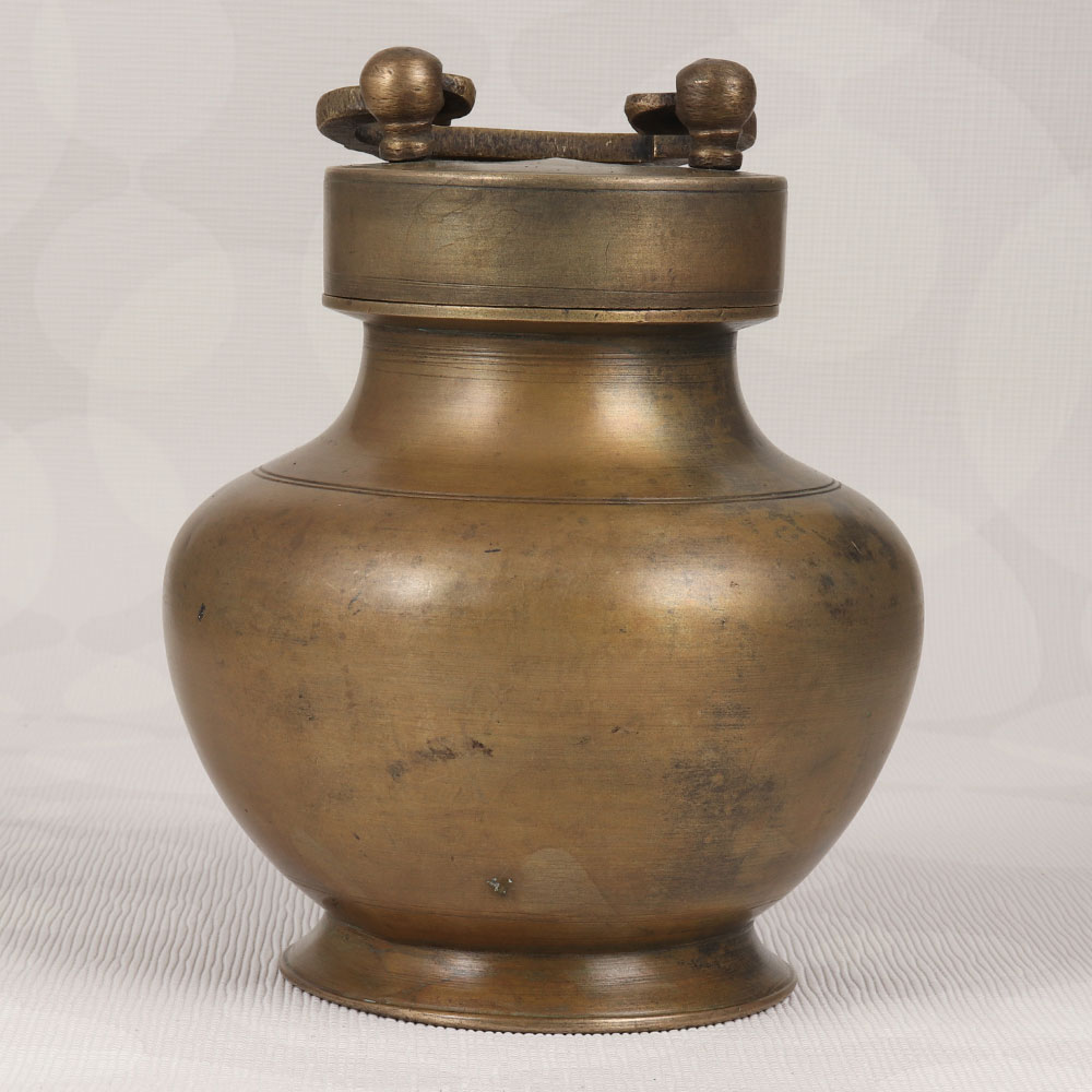 Buy a Vintage Brass Holy Water Pot online that is a magnificent embodiment of Himalayan Art crafted by highly talented Indian artisans. This piece is made from high-quality brass and showcases a rich antique brown finish, adding a touch of heritage and grace to any setting. Designed with meticulous attention to detail, the pot features a secure lid with a convenient handle, allowing for easy handling and transport. This versatile artefact transcends its spiritual origins, doubling as a unique indoor flower pot that seamlessly complements any decor. Its antique charm makes it a striking addition to homes, offices, restaurants, hotels, or cafes, bringing a sense of cultural richness and history to your surroundings. Beyond its aesthetic appeal, this holy water pot is a thoughtful gift for your family, friends or relatives on special, festive, or auspicious occasions. Whether placed as a centerpiece or added to a vintage collection, this handmade creation invites an air of sophistication and reverence.