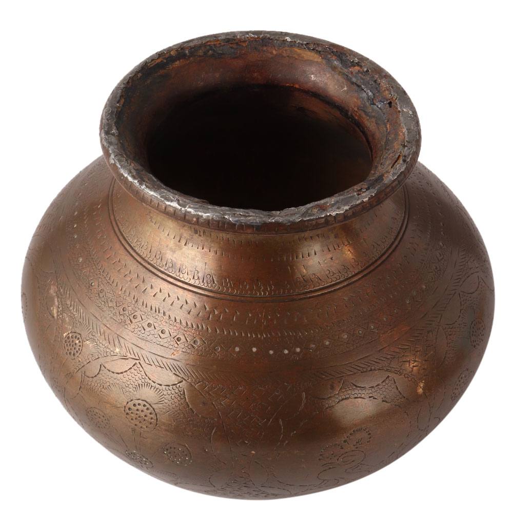 A brass water pot in an elegant brown antique finish to give your home, restaurant and hotel a vintage look. This brass water pot is used in Hindu rituals, havans and temples to hold sacred water, flowers, rice and gold coins. Since ancient times, lotas have been used in morning sun prayers to offer water to the Sun God to keep the spirit and mind balanced, and to offer water to the Shivling to spread positive energy in the environment. Place this exquisite pot as an indoor flower pot to enhance your entryway, living room, patio garden or hallway.