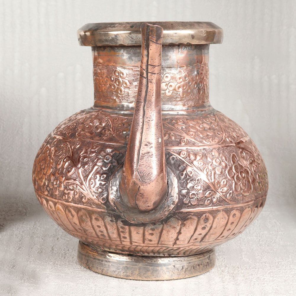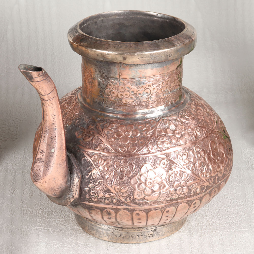 This Copper Water Pot with Spout is a true masterpiece of craftsmanship which is handmade by highly skilled and experienced artisans hailing from the culturally rich city of Hyderabad, India. Crafted from high-quality copper, this enchanting piece showcases a mesmerizing antique brown finish, reminiscent of the timeless Islamic Art, adding an element of grandeur to any space it graces. The pot's surface is adorned with intricate engravings, each telling a unique story through its beautifully designed patterns. This copper pot is a versatile addition to your home, office, restaurant, hotel, or cafe, capable of elevating any setting. Its aesthetic appeal transcends boundaries, making it a stunning decorative piece. It can also serve as a charming flower pot, infusing your surroundings with a touch of elegance. Moreover, this pot is not just about aesthetics, it can be employed during rituals or as a vessel to hold holy water, adding a sacred element to your spiritual practices. Furthermore, it makes for an exceptional gift for your family, friends or relatives on special, festive, or auspicious occasions, symbolizing your appreciation for their presence in your life.