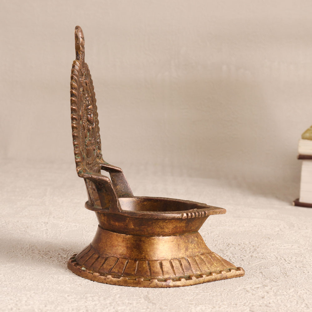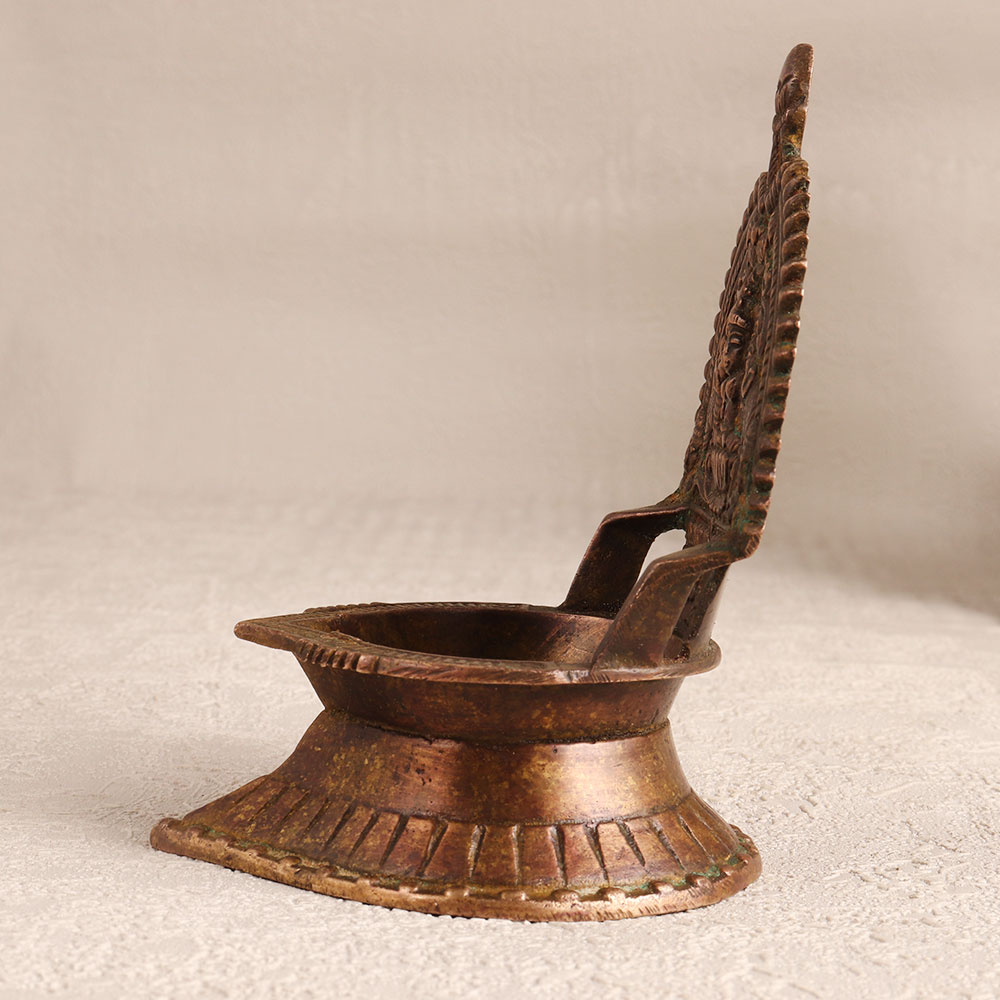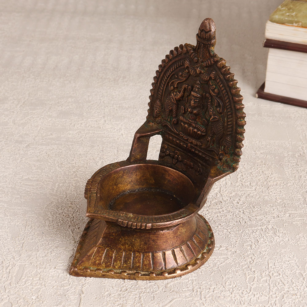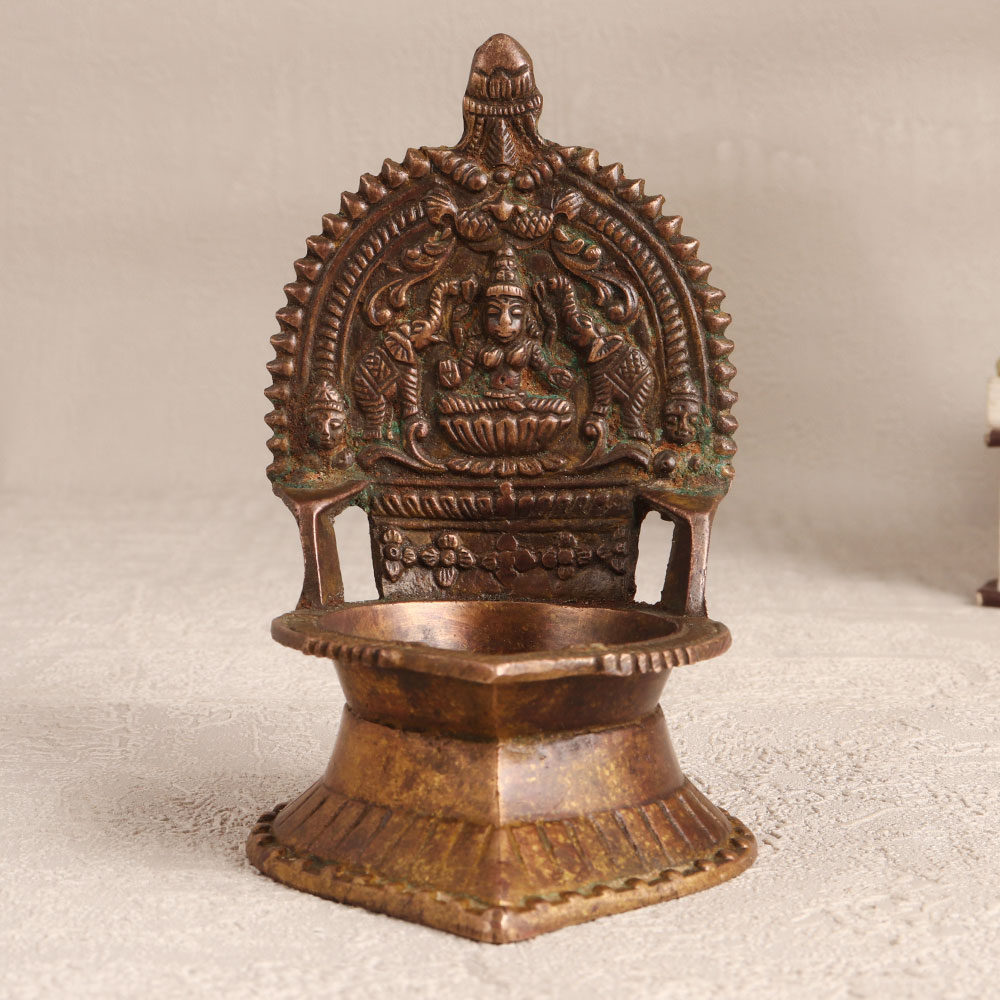 A Vintage Brass Gajlakshmi Oil Lamp which is a timeless piece that echoes the rich cultural heritage of India. Also known as the Gajlaxmi oil lamp, this creation is a manifestation of divine grace. Crafted by highly skilled Indian artisans, the lamp features an antique brown finish that adds an aura of sophistication to any space. Handmade from high-quality brass, this lamp is not just a symbol of traditional elegance but a functional item for spiritual rituals. It can be ignited using mustard oil or ghee with a cotton wick, creating a warm and serene ambiance perfect for prayer. Its versatile design allows it to seamlessly adorn homes, offices, restaurants, hotels, or cafes, especially in prayer rooms. This vintage masterpiece is not only a valuable addition to your antique collection but also a thoughtful gift for your family, friends or relatives on special, festive, or auspicious occasions.