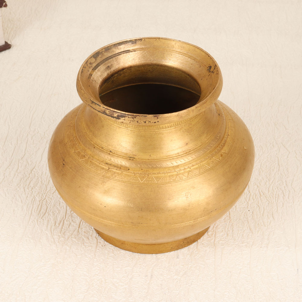 Immerse your sacred rituals in timeless elegance with this Vintage Brass Holy Water Pot. Handcrafted by professional Indian artisans from Gujarat, this piece showcases the rich heritage of traditional craftsmanship. Made from high-quality brass, the pot features an antique brown finish that exudes an aura of antiquity and spiritual significance. Perfect for rituals, havans, and offering water to the Shivling in temples, this holy water pot adds a touch of divine grace to your spiritual practices. Its versatile design allows it to be seamlessly integrated into various settings, making it a captivating addition to your home, office, restaurant, hotel, or cafe. The pot's aesthetic allure also makes it a remarkable decorative piece, enhancing the ambiance with its vintage charm. As a thoughtful gift, this handcrafted masterpiece is ideal for presenting to your family, friends or relatives on special, festive, or auspicious occasions.