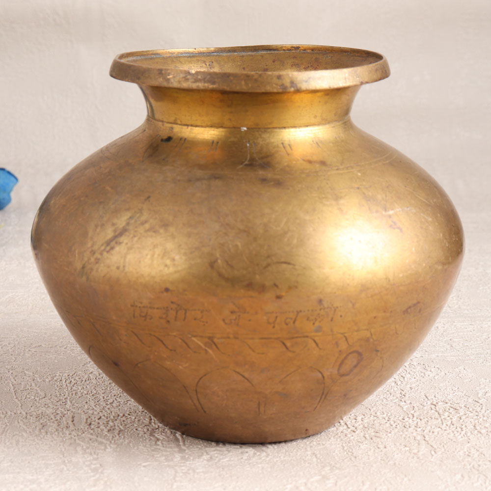Immerse yourself in the rich cultural heritage of India with this exquisite vintage brass holy water pot. Handmade by highly skilled artisans from the heartland of Gujarat, this stunning piece features a distinctive antique brown finish that adds a touch of rustic charm to any space. This holy water pot is meticulously fashioned using high-quality brass, ensuring both its durability and aesthetic appeal. Its versatility is unmatched, making it an ideal addition to your home, office, hotel, cafe, shop, or restaurant's prayer room. Use it during your prayers, and its beauty is equally appreciated as a small flower pot, bringing a sense of tranquillity to your environment. Whether you're a collector of vintage artefacts or looking for a unique decor piece, this holy water pot is a splendid choice. Display it at exhibitions to showcase its historical and artistic significance. The holy water pot also makes for a meaningful and cherished gift for your family, friends or relatives on special, festive, or auspicious occasions, adding a touch of spirituality and elegance to their lives.