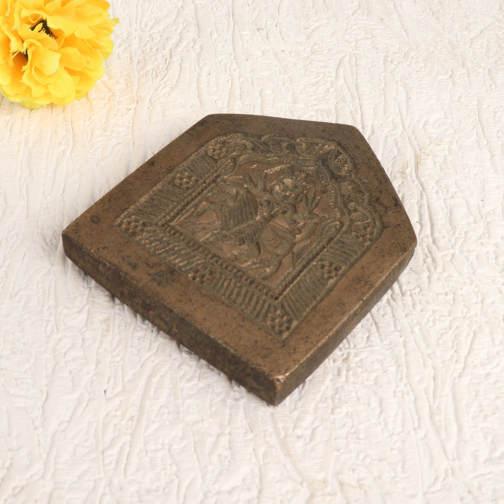 Adorn your home, office, restaurant, hotel, cafe, or shop's ambiance with the exquisite charm of this vintage Bell Metal Jewelry Mold. Crafted with precision by highly talented Indian craftsmen, this masterpiece features an intricate engraving of a god figure, exuding timeless allure. The antique brown finish lends a sense of history and character to any space, making it the perfect choice for collectors of vintage artefacts. Handmade with the utmost care and precision, this jewelry mold is constructed from high-quality bell metal, known for its durability and rich sheen. Traditionally used by gold and silver smiths to create intricate jewelry pieces, it now finds a new purpose as a captivating decorative element for your surroundings. The fusion of artistry and functionality makes it an ideal conversation starter and a captivating addition to your vintage collection. It also serves as a thoughtful and meaningful gift for your family, friends or relatives during special, festive, or auspicious occasions, celebrating the essence of Indian craftsmanship and culture.