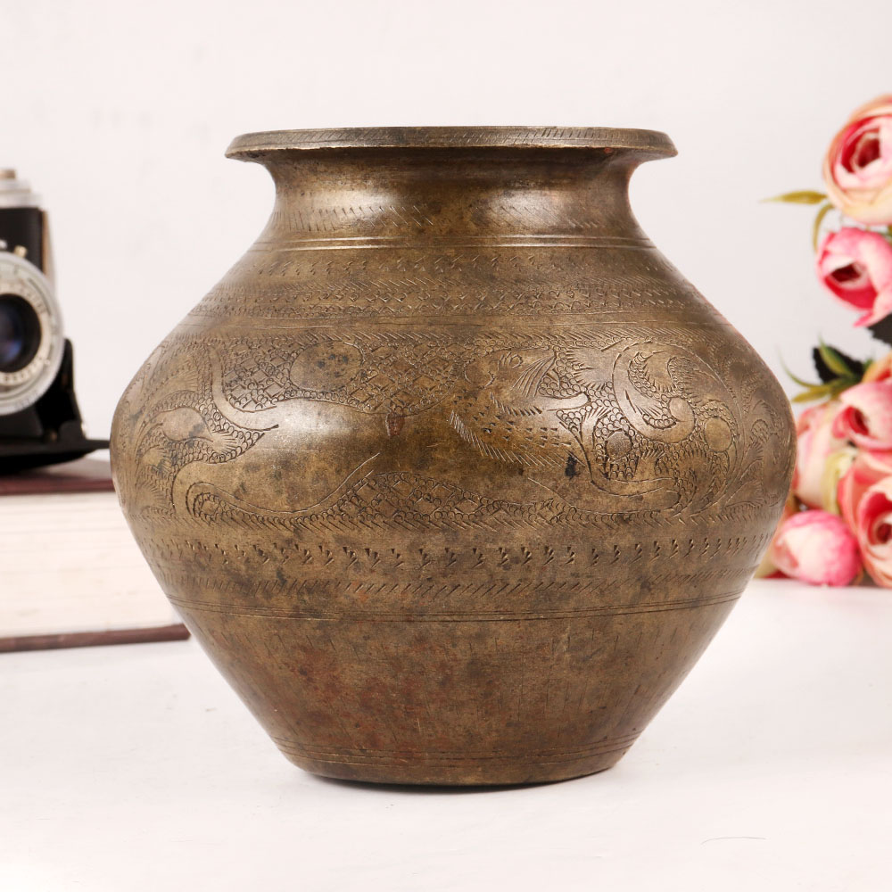 Buy a brass holy water pot or Lota, a masterpiece carved with intricate designs and boasting an antique brown finish. This magnificent piece is lovingly handmade by highly skilled Indian artisans, employing traditional methods passed down through generations. Crafted from high-quality brass, it immediately captures attention with its captivating aesthetics, making it a stunning addition to any decor. Placing it in the north or east direction of a house is believed to amplify positive energy within the entire space. Primarily used in temples, this holy water pot serves the sacred purpose of offering water to the Shivling. It is also utilized for offering water to the Sun God, facilitating the balance of spirit and mind. Versatile in its functionality, this water pot finds significance during havans, Hindu rituals, and auspicious functions, where it acts as a vessel for storing holy water. Its charm extends beyond religious occasions, as it can also double as an indoor flower pot, adorning homes and offices with its elegance. The Brass Holy Water Pot makes for an exceptional gift for family, friends, or relatives on special, festive, or auspicious occasions. Embodying the rich cultural heritage of India, it is a testament to the timeless artistry of its creators and a symbol of spirituality and grace.