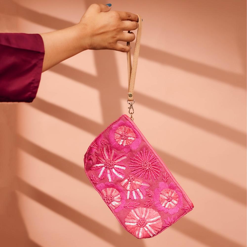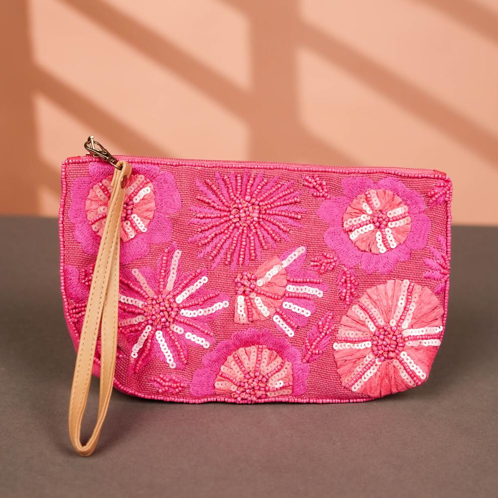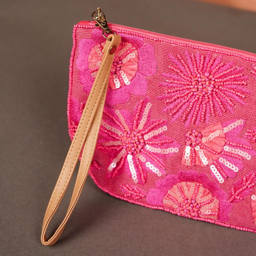 For those who love pink with personality, this cotton and beads handbag is a beautiful blend of feminine flair and lively detail. The detailed hand-beading forms radiant floral bursts across the surface, giving it both elegance and fun. Designed with a tan wristlet strap and secure zip-top closure, this bag is ready to accompany you from daytime outings to night-time adventures.