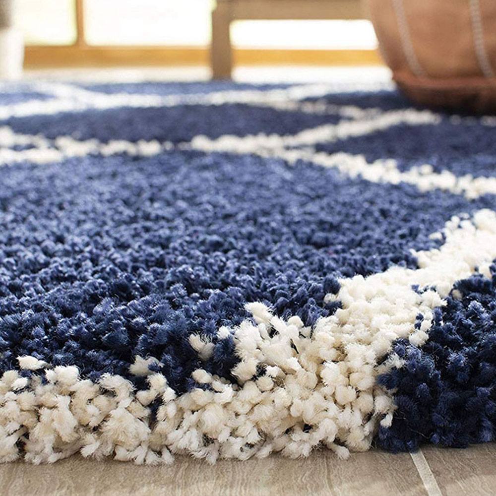 This Navy Blue and Ivory shaggy rug features a timeless lattice pattern, handcrafted from soft microfiber to bring both comfort and elegance to your living space. Its soothing color contrast and plush pile make it an ideal addition for modern, bohemian, or classic interiors. Each rug is carefully packed and quality-checked by Indianshelf artisans.