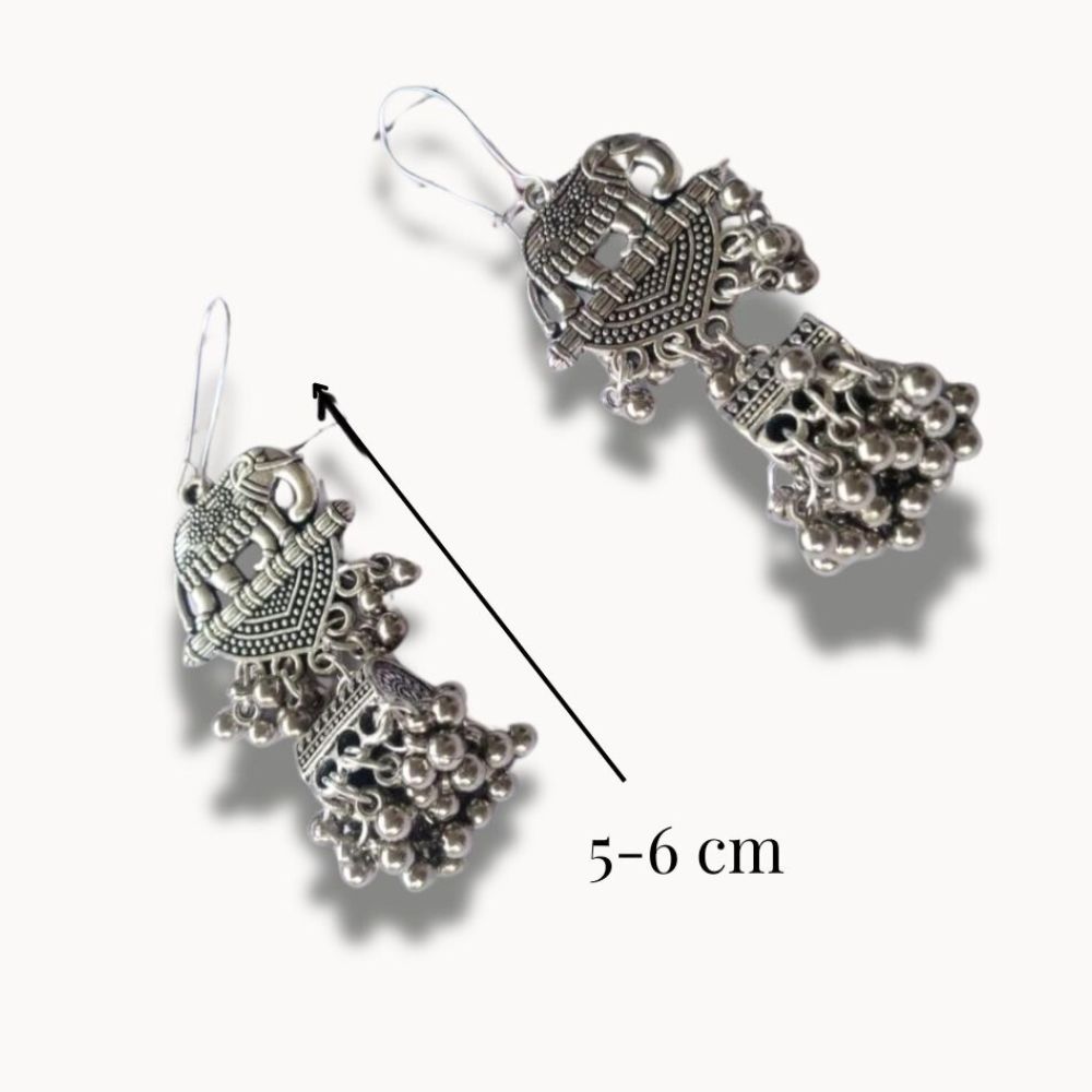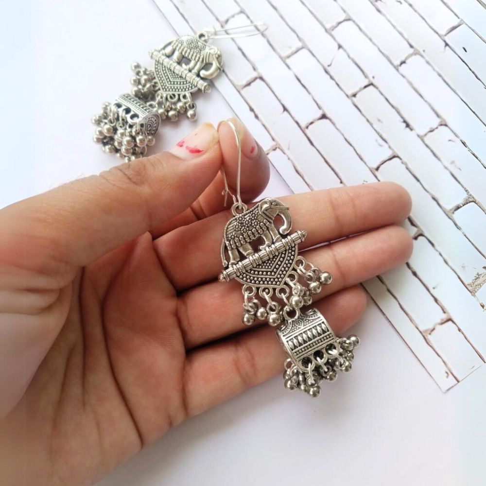 The Elephant Design Silver Oxidised Earrings are a tribute to Indian symbolism expressed through timeless craftsmanship. Crafted on a fabric base, the silver oxidised finish lends an antique, heritage-inspired character that feels both grounded and elegant. The elephant motif adds cultural meaning, representing wisdom, strength, and prosperity. Balanced in size and weight, these earrings are designed to feel expressive yet comfortable for regular wear.