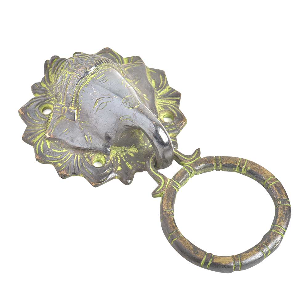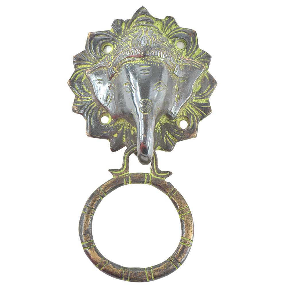 The Elephant head Brass door knocker with a towel ing has a very positive object to have on your door. According to hindu mythology, the Elephant head god Ganesha, brings peace and prosperity. User it as a door knocker or as a towel ring.