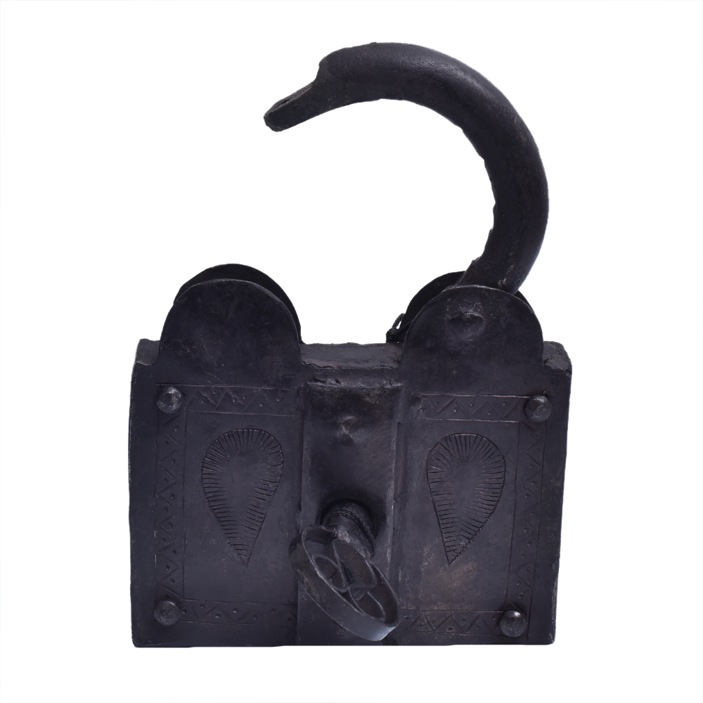 This wistful padlock is constructed traditionally from cast iron. It is a remarkable decorative item in the antique style that draws attention well because of its charmingly nostalgic appearance. The lock is constructed of heavy-duty cast iron and is finished in an aged brown color. - It is only suitable for decorative uses and is not functional. A single key is strung along a thread.