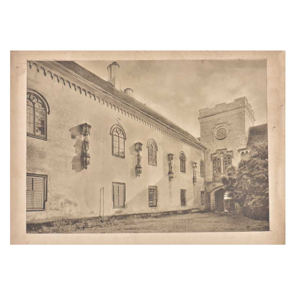 This is an old print of an side elevattion of a residential house with beautiful archetectural design on the wall in a remote place . It shows arched windows and the wall extends to a gate that seems to the entry door or main gate of the house. A lovely wall decor item and an excellent gifting item.